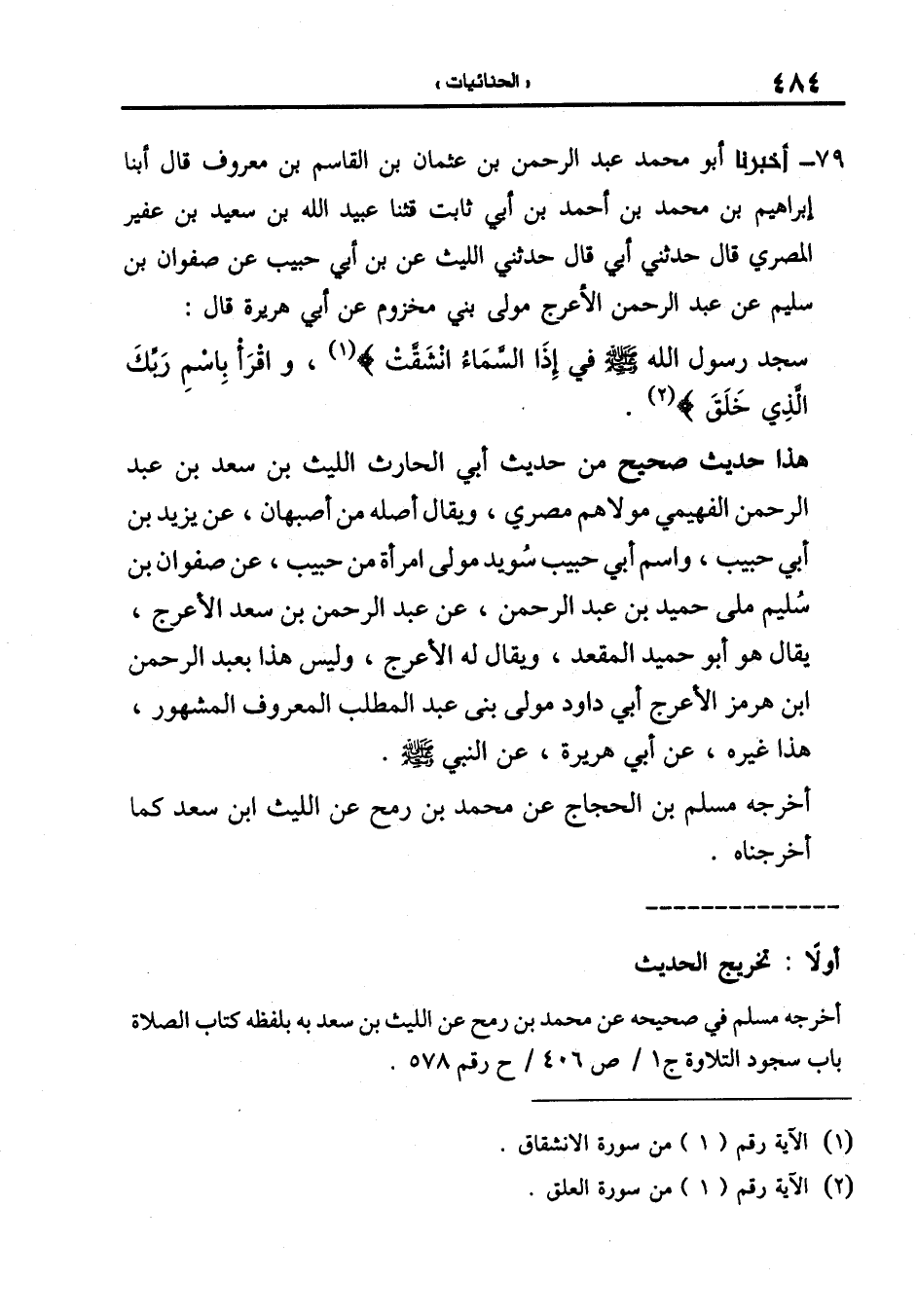 79-[82] أَخْبَرَنَا أَبُو مُحَمَّدٍ عَبْدُ الرَّحْمَنِ بْنُ عُثْمَانَ بن القاسم بن معروف قال أبنا إِبْرَاهِيمُ بْنُ مُحَمَّدِ بْنِ أَحْمَدَ بْنِ أَبِي ثابت قال: ثنا عُبَيْدُ اللَّهِ بْنُ سَعِيدِ بْنِ عُفَيْرٍ الْمِصْرِيُّ قَالَ حَدَّثَنِي أَبِي قَالَ حَدَّثَنِي اللَّيْثُ عَنِ ابْنِ أَبِي حَبِيبٍ عَنْ صَفْوَانَ بْنِ سُلَيْمٍ عَنْ عَبْدِ الرَّحْمَنِ الْأَعْرَجِ مَوْلَى بَنِي مَخْزُومٍ عَنْ أَبِي هُرَيْرَةَ قَالَ: سَجَدَ رَسُولِ اللَّهِ صَلَّى اللَّهُ عَلَيْهِ وَسَلَّمَ فِي {إِذَا السَّمَاءُ انشقت} {واقرأ باسم رَبِّكَ الَّذِي خَلَقَ} .