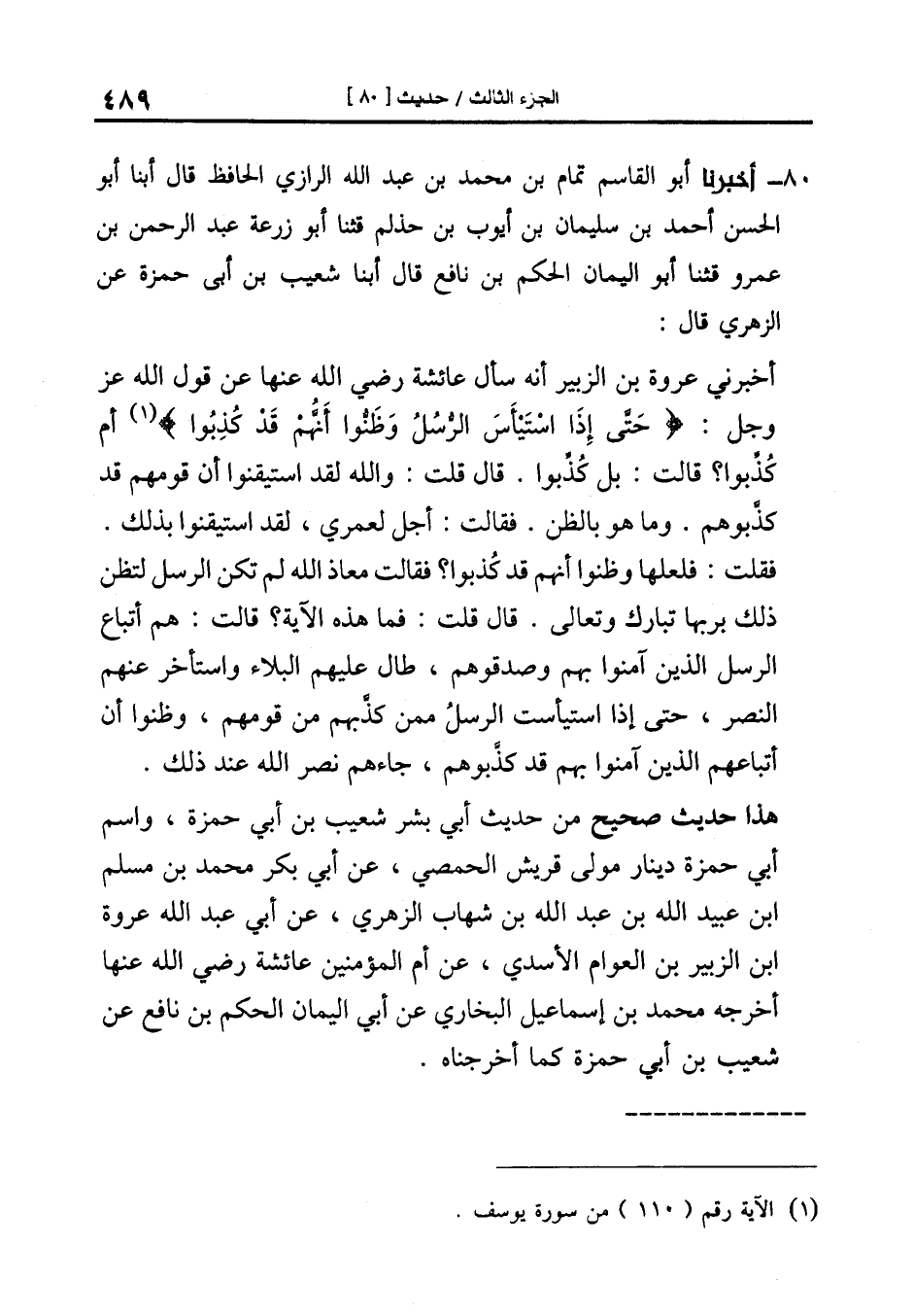 80-[83] أَخْبَرَنَا أَبُو الْقَاسِمِ تَمَّامُ بْنُ مُحَمَّدِ بْنِ عبد الله الرازي الحافظ قال أبنا أَبُو الْحَسَنِ أَحْمَدُ بْنُ سُلَيْمَانَ بْنِ أَيُّوبَ بْنِ حَذْلَمٍ قَالَ: ثنا أَبُو زُرْعَةَ عَبْدُ الرَّحْمَنِ بْنُ عَمْرٍو قَالَ: ثنا أبو اليمان الحكم بن نافع قال أبنا شُعَيْبُ بْنُ أَبِي حَمْزَةَ عَنِ الزُّهْرِيِّ قَالَ: أَخْبَرَنِي عُرْوَةُ بْنُ الزُّبَيْرِ أَنَّهُ سَأَلَ عَائِشَةَ رَضِيَ اللَّهُ عَنْهَا عَنْ قَوْلِ اللَّهِ عَزَّ وَجَلَّ {حَتَّى إِذَا اسْتَيْأَسَ الرُّسُلُ وَظَنُّوا أَنَّهُمْ قد كذبوا} أَمْ كُذِبُوا؟ قَالَتْ: بَلْ كُذِّبُوا. قَالَ قُلْتُ: وَاللَّهِ لَقَدِ اسْتَيْقَنُوا أَنَّ قَوْمَهُمْ قَدْ كَذَّبُوهُمْ وَمَا هُوَ بِالظَّنِّ. فَقَالَتْ: أَجَلْ لَعَمْرِي لَقَدِ استيقنوا بذلك. فقلت: فلعلها وظنوا أنهم قد كذبوا؟ فقالت معاذ الله لم تكن الرُّسُلُ لِتَظُنَّ ذَلِكَ بِرَبِّهَا تَبَارَكَ وَتَعَالَى. قَالَ قلت: فما هذه الآية؟ قالت: هم أتباع الرسل الذين آمنوا بهم وَصَدَّقُوهُمْ طَالَ عَلَيْهِمُ الْبَلَاءُ وَاسْتَأْخَرَ عَنْهُمُ النَّصْرُ حَتَّى إِذَا اسْتَيْأَسَتِ الرُّسُلُ مِمَّنْ كَذَّبَهُمْ مِنْ قَوْمِهِمْ وَظَنُّوا أَنَّ أَتْبَاعَهُمُ الَّذِينَ آمَنُوا بِهِمْ قَدْ كَذَّبُوهُمْ جَاءَهُمْ نَصْرُ اللَّهِ عِنْدَ ذَلِكَ.