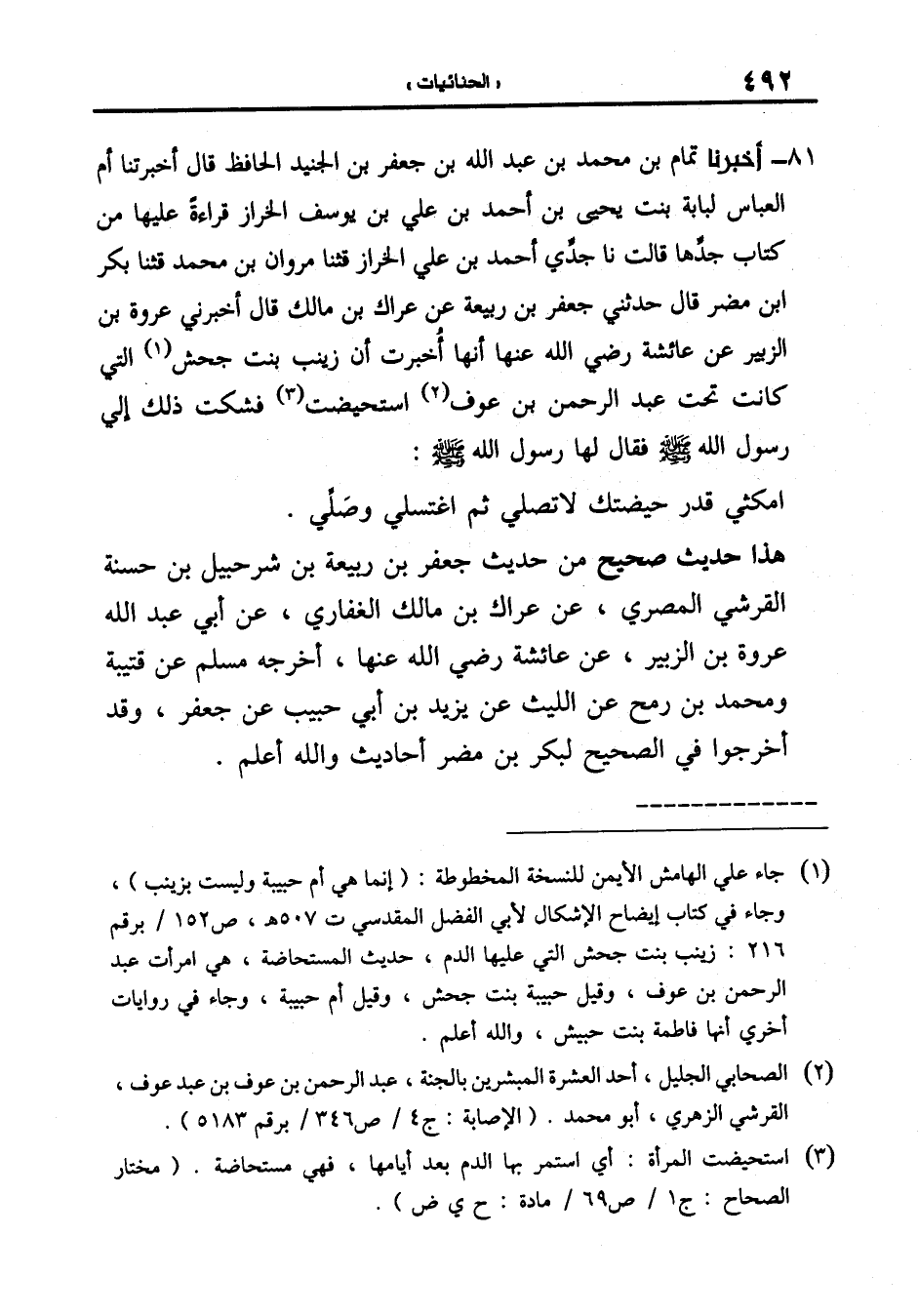 81-[84] أَخْبَرَنَا تَمَّامُ بْنُ مُحَمَّدِ بْنِ عَبْدِ اللَّهِ بْنِ جَعْفَرِ بْنِ الْجُنَيْدِ الْحَافِظُ قَالَ أَخْبَرَتْنَا أُمُّ الْعَبَّاسِ لُبَابَةُ بِنْتُ يَحْيَى بْنِ أَحْمَدَ بْنِ عَلِيِّ بْنِ يُوسُفَ الْخَرَّازِ قِرَاءَةً عَلَيْهَا من كتاب جدها قالت نا جدي أحمد بن علي الخراز قال: ثنا مروان بن محمد قال: ثنا بَكْرُ بْنُ مُضَرَ قَالَ حَدَّثَنِي جَعْفَرُ بْنُ رَبِيعَةَ عَنْ عِرَاكِ بْنِ مَالِكٍ قَالَ أَخْبَرَنِي عُرْوَةُ بْنُ الزُّبَيْرِ عَنْ عَائِشَةَ رَضِيَ اللَّهُ عَنْهَا أَنَّهَا أَخْبَرَتْ أَنَّ زَيْنَبَ بِنْتَ جَحْشٍ الَّتِي كَانَتْ تَحْتَ عَبْدِ الرَّحْمَنِ بْنِ عَوْفٍ اسْتُحِيضَتْ فَشَكَتْ ذَلِكَ إِلَى رَسُولُ اللَّهِ صَلَّى اللَّهُ عَلَيْهِ وَسَلَّمَ فَقَالَ لَهَا رَسُولُ اللَّهِ صَلَّى اللَّهُ عَلَيْهِ وَسَلَّمَ: امْكُثِي قَدْرَ حَيْضَتِكِ لَا تُصَلِّي ثُمَّ اغْتَسِلِي وَصَلِّي.