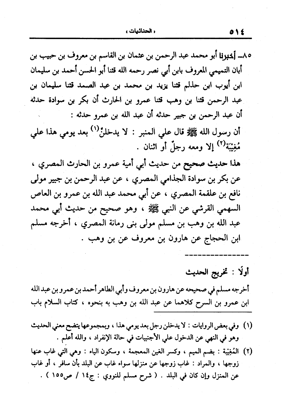 85-[88] أَخْبَرَنَا أَبُو مُحَمَّدٍ عَبْدُ الرَّحْمَنِ بْنُ عُثْمَانَ بْنِ الْقَاسِمِ بْنِ مَعْرُوفِ بْنِ حَبِيبِ بْنِ أَبَانٍ التَّمِيمِيُّ الْمَعْرُوفُ بِابْنِ أَبِي نَصْرٍ رَحِمَهُ الله قال: ثنا أَبُو الْحَسَنِ أَحْمَدُ بْنُ سُلَيْمَانَ بْنِ أَيُّوبَ بْنِ حَذْلَمٍ قال: ثنا يزيد بن محمد بن عبد الصمد قال: ثنا سليمان بن عبد الرحمن قال: ثنا ابن وهب قال: ثنا عَمْرُو بْنُ الْحَارِثِ أَنَّ بَكْرَ بْنَ سَوَادَةَ حَدَّثَهُ أَنَّ عَبْدَ الرَّحْمَنِ بْنَ جُبَيْرٍ حَدَّثَهُ أَنَّ عَبْدَ اللَّهِ بْنَ عَمْرٍو حَدَّثَهُ: أَنّ رَسُولَ اللَّهِ صَلَّى اللَّهُ عَلَيْهِ وَسَلَّمَ قَالَ عَلَى الْمِنْبَرِ: لَا يَدْخُلَنَّ بَعْدَ يَوْمِي هَذَا عَلَى مُغِيبَةٍ إِلَّا وَمَعَهُ رَجُلٌ أَوِ اثْنَانِ.