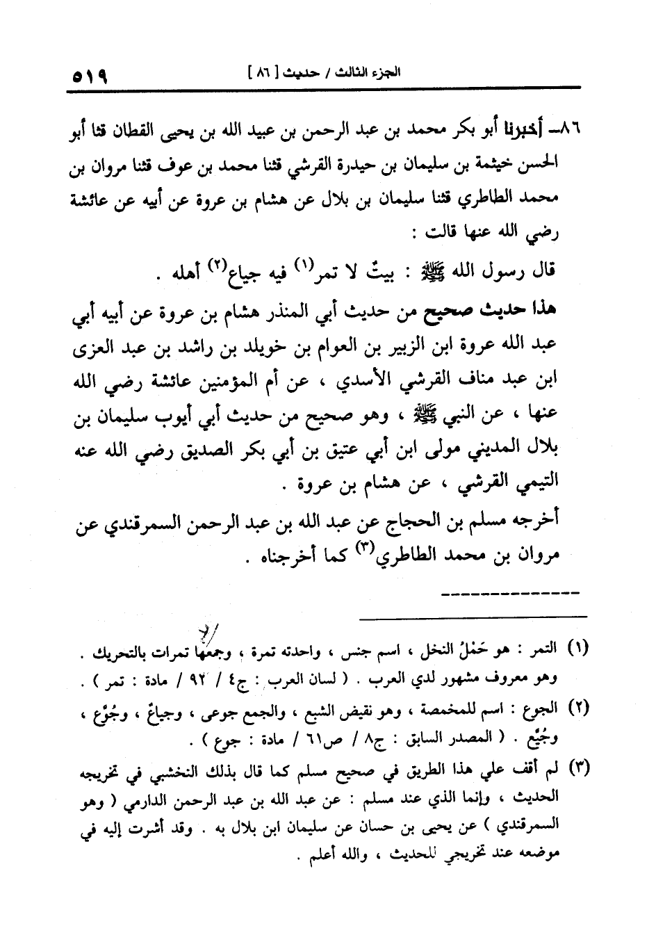 86-[89] أَخْبَرَنَا أَبُو بَكْرٍ مُحَمَّدُ بْنُ عَبْدِ الرَّحْمَنِ بن عبيد الله بن يحيى القطان قال: ثنا أَبُو الْحَسَنِ خَيْثَمَةُ بْنُ سُلَيْمَانَ بْنِ حَيْدَرَةَ القرشي قال: ثنا محمد بن عوف قال: ثنا مروان بن محمد الطاطري قال: ثنا سُلَيْمَانُ بْنُ بِلَالٍ عَنْ هِشَامِ بْنِ عُرْوَةَ عَنْ أَبِيهِ عَنْ عَائِشَةَ رَضِيَ اللَّهُ عَنْهَا قَالَتْ: قَالَ رَسُولُ اللَّهِ صَلَّى اللَّهُ عَلَيْهِ وَسَلَّمَ: بَيْتٌ لَا تَمْرَ فِيهِ جِيَاعٌ أَهْلُهُ.