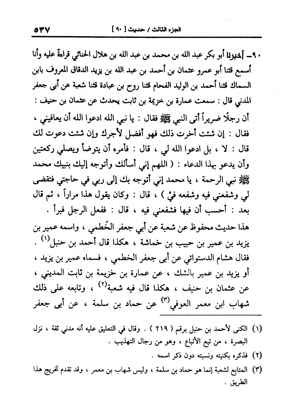 90-[94] أَخْبَرَنَا أَبُو بَكْرٍ عَبْدُ اللَّهِ بْنُ مُحَمَّدِ بْنِ عَبْدِ اللَّهِ بْنِ هِلَالٍ الْحِنَّائِيُّ قِرَاءَةً عليه وأنا أسمع قال: ثنا أَبُو عَمْرٍو عُثْمَانُ بْنُ أَحْمَدَ بْنِ عَبْدِ اللَّهِ بْنِ يَزِيدَ الدَّقَّاقُ الْمَعْرُوفُ بِابْنِ السَّمَّاكِ قال: ثنا أحمد بن الوليد الفحام قال: ثنا روح بن عبادة قال: ثنا شُعْبَةُ عَنْ أَبِي جَعْفَرٍ الْمَدَنِيِّ قَالَ: سَمِعْتُ عُمَارَةَ بْنَ خُزَيْمَةَ بْنِ ثَابِتٍ يُحَدِّثُ عَنْ عُثْمَانَ بْنِ حُنَيْفٍ: أَنَّ رَجُلًا ضَرِيرًا أَتَى النَّبِيَّ صَلَّى اللَّهُ عَلَيْهِ وَسَلَّمَ فَقَالَ: يَا نبي الله ادعو اللَّهَ أَنْ يُعَافِيَنِي فَقَالَ: إِنْ شِئْتَ أَخَّرْتُ ذَلِكَ فَهُوَ أَفْضَلُ لأَجْرِكَ وَإِنْ شِئْتَ دَعَوْتُ لك قال: لا بل ادعوا اللَّهَ لِي قَالَ: فَأَمَرَهُ أَنْ يَتَوَضَّأَ وَيُصَلِّيَ رَكْعَتَيْنِ وَأَنْ يَدْعُوَ بِهَذَا الدُّعَاءِ: " اللَّهُمَّ إِنِّي أَسْأَلُكَ وَأَتَوَجَّهُ إِلَيْكَ بِنَبِيِّكَ مُحَمَّدٍ صَلَّى اللَّهُ عَلَيْهِ وَسَلَّمَ نَبِيِّ الرَّحْمَةِ يَا مُحَمَّدُ إِنِّي أَتَوَجَّهُ بِكَ إِلَى رَبِّي فِي حَاجَتِي فَتُقْضَى لي وشفعني فيه وشفع فِيَّ " قَالَ: وَكَانَ يَقُولُ هَذَا مِرَارًا ثُمَّ قَالَ بَعْدُ: أَحْسَبُ أَنَّ فِيهَا فَشَفِّعْنِي فِيهِ، قال: ففعل الرجل فبرأ.