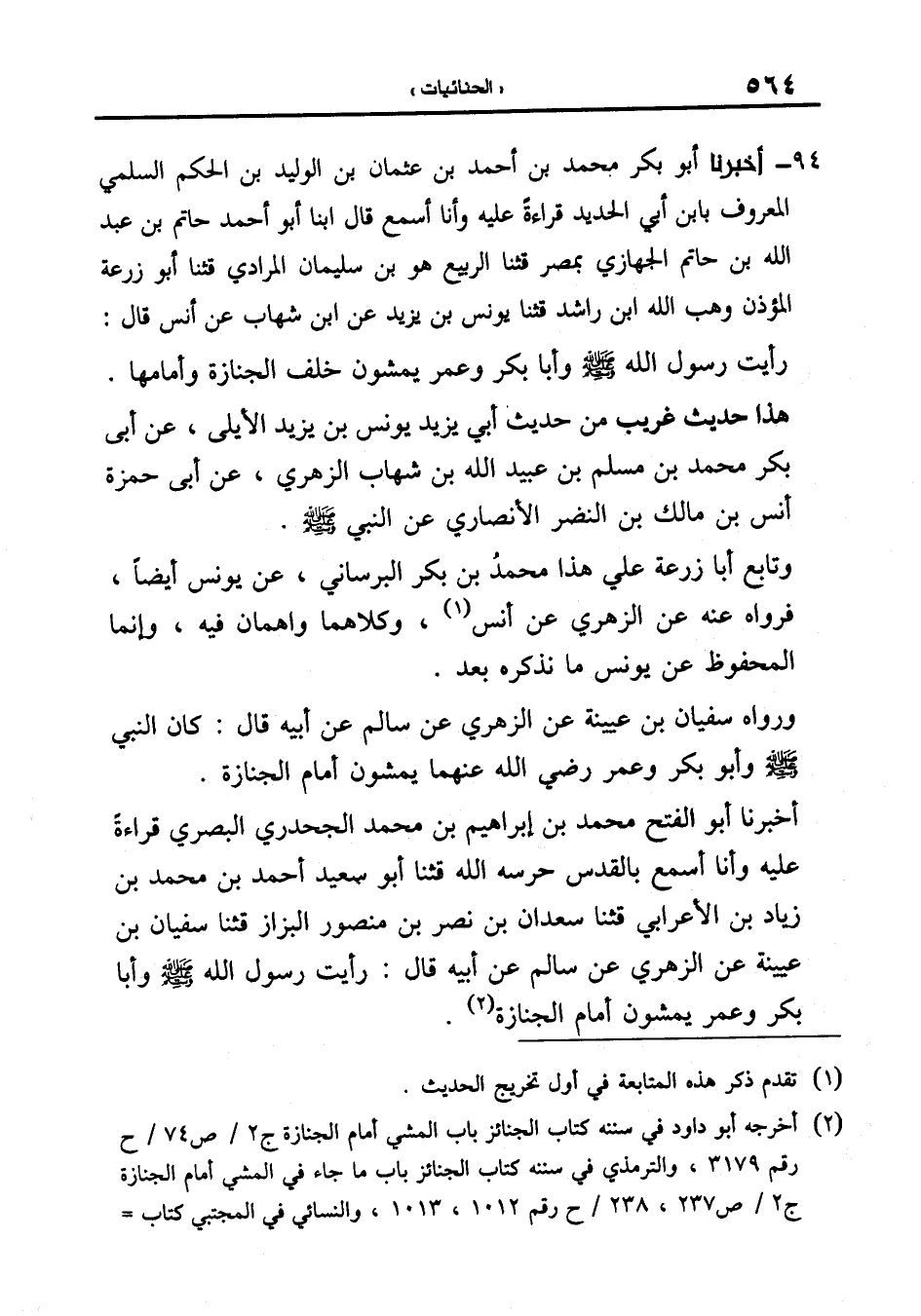 94-[100] أَخْبَرَنَا أَبُو بَكْرٍ مُحَمَّدُ بْنُ أَحْمَدَ بْنِ عُثْمَانَ بْنِ الْوَلِيدِ بْنِ الْحَكَمِ السُّلَمِيُّ الْمَعْرُوفُ بِابْنِ أَبِي الْحَدِيدِ قِرَاءَةً عَلَيْهِ وَأَنَا أَسْمَعُ قال أبنا أَبُو أَحْمَدَ حَاتِمُ بْنُ عَبْدِ اللَّهِ بْنِ حَاتِمٍ الجهازي بمصر قال: ثنا الربيع هو ابن سليمان المرادي قال: ثنا أَبُو زُرْعَةَ الْمُؤَذِّنُ وَهْبُ اللَّهِ بْنُ رَاشِدٍ قال: ثنا يُونُسُ بْنُ يَزِيدَ عَنِ ابْنِ شِهَابٍ عَنْ أَنَسٍ قَالَ: رَأَيْتُ رَسُولَ اللَّهِ صَلَّى اللَّهُ عَلَيْهِ وَسَلَّمَ وَأَبَا بَكْرٍ وَعُمَرَ يَمْشُونَ خَلْفَ الْجِنَازَةِ وَأَمَامَهَا.