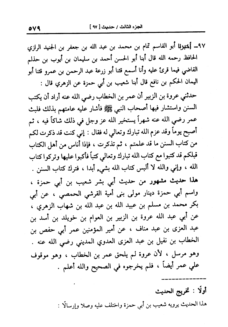 97-[104] أَخْبَرَنَا أَبُو الْقَاسِمِ تَمَّامُ بْنُ مُحَمَّدِ بْنِ عَبْدِ اللَّهِ بْنِ جَعْفَرِ بْنِ الْجُنَيْدِ الرَّازِيُّ الحافظ رحمه الله قال أبنا أَبُو الْحَسَنِ أَحْمَدُ بْنُ سُلَيْمَانَ بْنِ أَيُّوبَ بْنِ حَذْلَمٍ الْقَاضِي فِيمَا قُرِئَ عَلَيْهِ وَأَنَا أسمع قَالَ: ثنا أَبُو زُرْعَةَ عَبْدُ الرَّحْمَنِ بْنُ عَمْرٍو قَالَ: ثنا أبو اليمان الحكم بن نافع قال أبنا شُعَيْبُ بْنُ أَبِي حَمْزَةَ عَنِ الزُّهْرِيِّ قَالَ: حَدَّثَنِي عُرْوَةُ بْنُ الزُّبَيْرِ أَنَّ عُمَرَ بْنَ الْخَطَّابِ رَضِيَ اللَّهُ عَنْهُ أَرَادَ أَنْ يَكْتُبَ السُّنَنَ وَاسْتَشَارَ فِيهَا أَصْحَابَ النَّبِيِّ صَلَّى اللَّهُ عَلَيْهِ وَسَلَّمَ فَأَشَارَ عَلَيْهِ عَامَّتُهُمْ بِذَلِكَ فَلَبِثَ عُمَرُ رَضِيَ اللَّهُ عَنْهُ شَهْرًا يَسْتَخِيرُ اللَّهَ عَزَّ وَجَلَّ فِي ذَلِكَ شَاكًّا فِيهِ ثُمَّ أَصْبَحَ يَوْمًا وَقَدْ عَزَمَ اللَّهُ تَبَارَكَ وَتَعَالَى لَهُ فَقَالَ: إِنِّي قَدْ كُنْتُ ذَكَرْتُ لَكُمْ مِنْ كِتَابِ السُّنَنِ مَا قَدْ عَلِمْتُمْ ثُمَّ تَذَكَّرْتُ فَإِذَا أُنَاسٌ مِنْ أَهْلِ الْكِتَابِ قَبْلَكُمْ قَدْ كَتَبُوا مَعَ كِتَابِ اللَّهِ تَبَارَكَ وَتَعَالَى كُتُبًا فَأَكَبُّوا عَلَيْهَا وَتَرَكُوا كِتَابَ اللَّهِ وَإِنِّي وَاللَّهِ لَا أُلْبِسُ كِتَابَ اللَّهِ بِشَيْءٍ أَبَدًا فَتَرَكَ كِتَابَ السُّنَنِ.