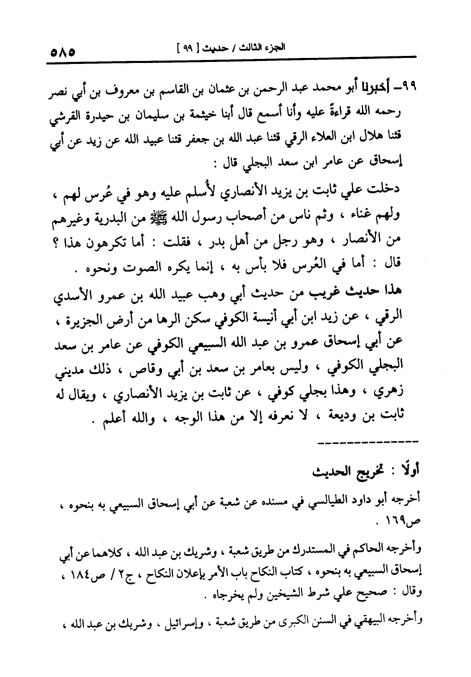 99-[106] أَخْبَرَنَا أَبُو مُحَمَّدٍ عَبْدُ الرَّحْمَنِ بْنُ عُثْمَانَ بن القاسم بن معروف بن أَبِي نَصْرٍ رَحِمَهُ اللَّهُ قِرَاءَةً عَلَيْهِ وَأَنَا أَسْمَعُ قَالَ أبنا خيثمة بن سليمان بن حيدرة القرشي قال: ثنا هلال بن العلاء الرقي قال: ثنا عبد الله بن جعفر قال: ثنا عُبَيْدُ اللَّهِ عَنْ زَيْدٍ عَنْ أَبِي إِسْحَاقَ عَنْ عَامِرِ بْنِ سَعْدٍ الْبَجَلِيِّ قَالَ: دَخَلْتُ عَلَى ثَابِتِ بْنِ يَزِيدَ الْأَنْصَارِيِّ لِأُسَلِّمَ عَلَيْهِ وَهُوَ فِي عُرْسٍ لَهُمْ وَلَهُمْ غِنَاءٌ وَثَمَّ نَاسٌ مِنْ أَصْحَابِ رَسُولُ اللَّهِ صَلَّى اللَّهُ عَلَيْهِ وَسَلَّمَ مَنِ الْبَدْرِيَّةِ وَغَيْرُهُمْ مِنَ الْأَنْصَارِ وَهُوَ رَجُلٌ مِنْ أَهْلِ بَدْرٍ فَقُلْتُ: أَمَا تَكْرَهُونَ هَذَا؟ قَالَ: أَمَّا فِي الْعُرْسِ فَلَا بَأْسَ بِهِ إِنَّمَا يُكْرَهُ الصَّوْتُ وَنَحْوُهُ.