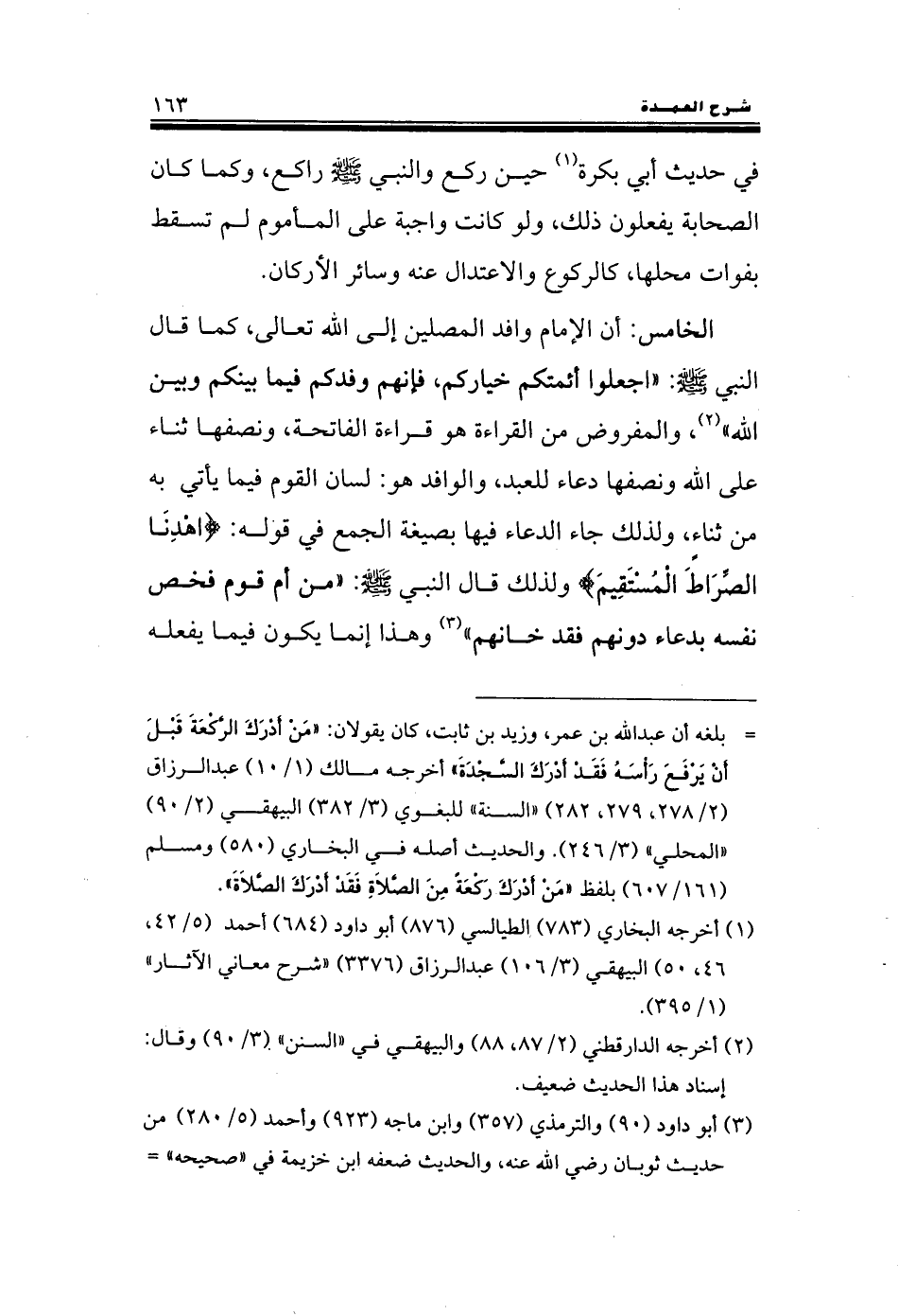 الخامس: أن الإمام وافد المصلين إلى الله تعالى, كما قال النبي صلى الله عليه وسلم: «اجعلوا أئمتكم خياركم, فإنهم وفدكم فيما بينكم وبين الله» , والمفروض من القراءة هو قراءة الفاتحة, ونصفها ثناء على الله ونصفها دعاء للعبد, والوافد هو: لسان القوم فيما يأتي به من ثناءٍ, ولذلك جاء الدعاء فيها بصيغة الجمع في قوله: {اهْدِنَا الصِّرَاطَ الْمُسْتَقِيمَ} ولذلك قال النبي صلى الله عليه وسلم: «من أم قوم فخص نفسه بدعاء دونهم فقد خانهم» وهذا إنما يكون فيما يفعله