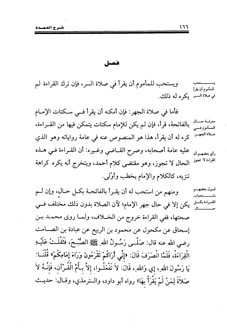 ومنهم من استحب له أن يقرأ بالفاتحة بكل حالٍ, وإن لم يكن إلا في حال جهر الإمام؛ لأن الصلاة بدون ذلك مختلف في صحتها, ففي القراءة خروج من الخلاف, ولما روى محمد بن إسحاق عن مكحول عن محمود بن الربيع عن عبادة بن الصامت رضي الله عنه قال: صَلَّى رَسُولُ اللهِ صلى الله عليه وسلم الصُّبْحَ, فَثَقُلَتْ عَلَيْهِ الْقِرَاءَةُ, فَلَمَّا انْصَرَفَ قَالَ: «إِنِّي أَرَاكُمْ تَقْرَءُونَ وَرَاءَ إِمَامِكُمْ» قُلْنَا: يَا رَسُولَ اللهِ, إِي وَاللهِ, قَالَ: لاَ تَفْعَلُوا, إِلاَّ بِأُمِّ الْقُرْآنِ, فَإِنَّهُ لاَ صَلاَةَ لِمَنْ لَمْ يَقْرَأْ بِهَا» رواه أبو داود, والترمذي, وقال: حديث