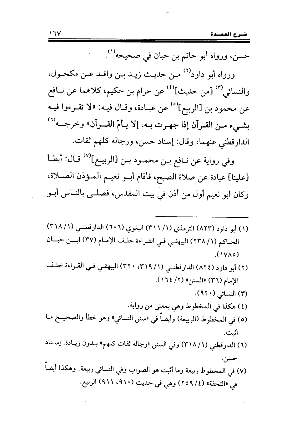 ورواه أبو داود من حديث زيد بن واقد عن مكحول, والنسائي [من حديث] عن حرام بن حكيم, كلاهما عن نافع عن محمود بن [الربيع] عن عبادة, وقال فيه: «لا تقرءوا فيه بشيء من القرآن إذا جهرت به, إلا بأمّ القرآن» وخرجه الدارقطني عنهما, وقال: إسناد حسن, ورجاله كلهم ثقات.