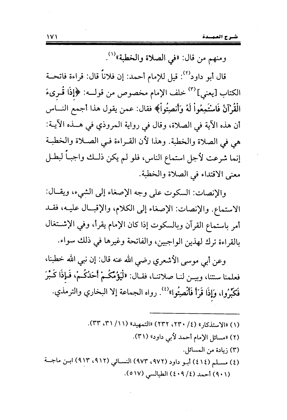 قال أبو داود: قيل للإمام أحمد: إن فلاناً قال: قراءة فاتحة الكتاب [يعني] خلف الإمام مخصوص من قوله: {إِذَا قُرِئَ الْقُرْآنُ فَاسْتَمِعُواْ لَهُ وَأَنْصِتُواْ} فقال: عمن يقول هذا أجمع الناس أن هذه الآية في الصلاة, وقال في رواية المروذي في هذه الآية: هي في الصلاة والخطبة. وهذا لأن القراءة في الصلاة والخطبة إنما شرعت لأجل استماع الناس, فلو لم يكن ذلك واجباً لبطل معنى الاقتداء في الصلاة والخطبة.