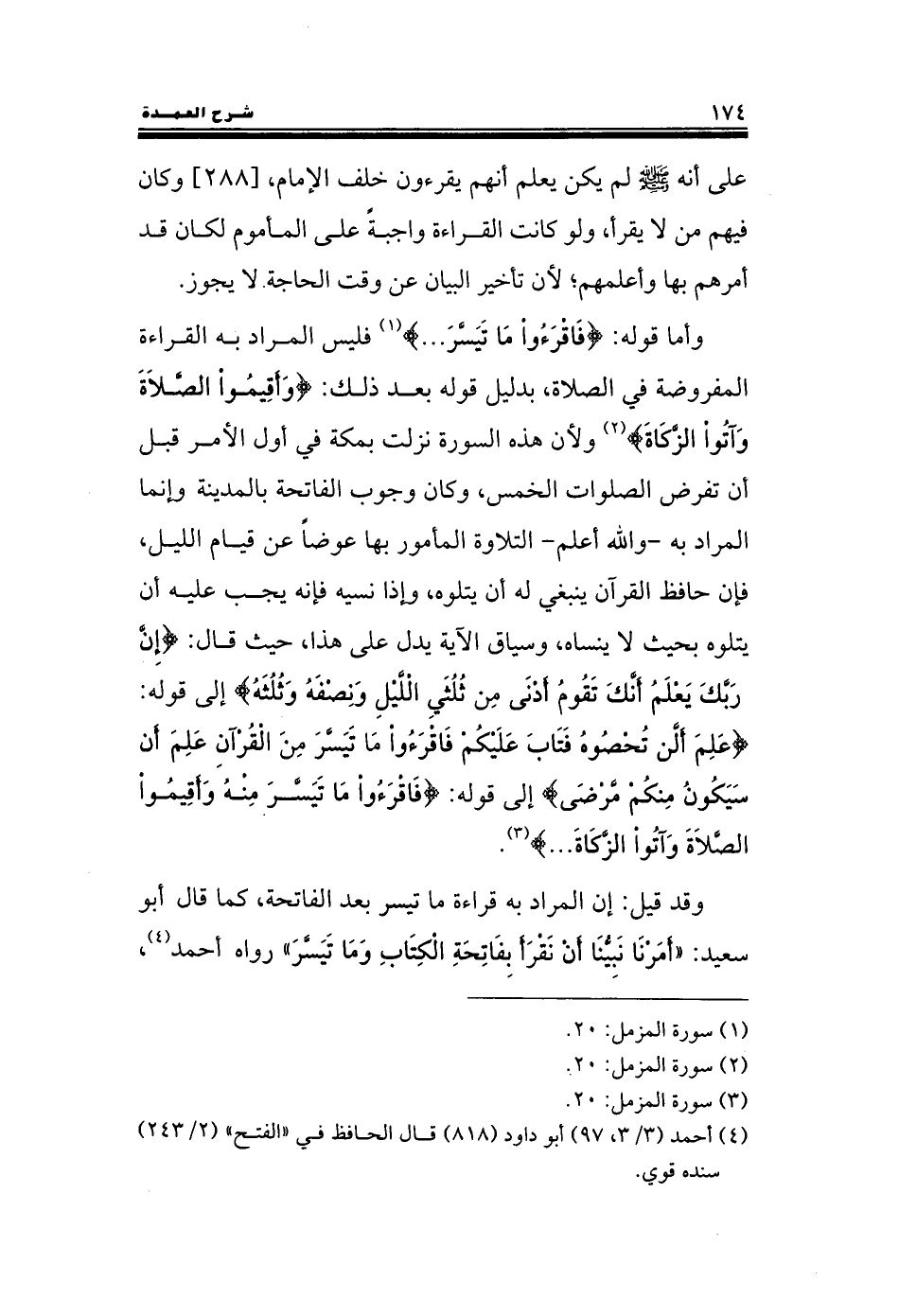 وأما قوله: {فَاقْرَءُوا مَا تَيَسَّرَ ...} فليس المراد به القراءة المفروضة في الصلاة, بدليل قوله بعد ذلك: {وَأَقِيمُوا الصَّلاَةَ وَآتُوا الزَّكَاةَ} ولأن هذه السورة نزلت بمكة في أول الأمر قبل أن تفرض الصلوات الخمس, وكان وجوب الفاتحة بالمدينة وإنما المراد به -والله أعلم- التلاوة المأمور بها عوضاً عن قيام الليل, فإن حافظ القرآن ينبغي له أن يتلوه, وإذا نسيه فإنه يجب عليه أن يتلوه بحيث لا ينساه, وسياق الآية يدل على هذا, حيث قال: {إِنَّ رَبَّكَ يَعْلَمُ أَنَّكَ تَقُومُ أَدْنَى مِنْ ثُلُثَيِ اللَّيْلِ وَنِصْفَهُ وَثُلُثَهُ} إلى قوله: {عَلِمَ أَنْ لَنْ تُحْصُوهُ فَتَابَ عَلَيْكُمْ فَاقْرَءُوا مَا تَيَسَّرَ مِنَ الْقُرْآنِ عَلِمَ أَنْ سَيَكُونُ مِنْكُمْ مَرْضَى} إلى قوله: {فَاقْرَءُوا مَا تَيَسَّرَ مِنْهُ وَأَقِيمُوا الصَّلَاةَ وَآتُوا الزَّكَاةَ ...}.