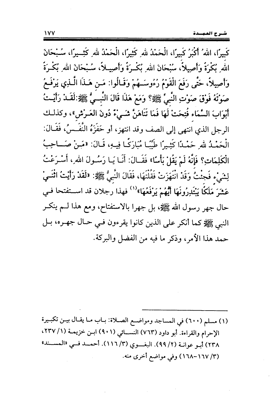 كَبِيرًا, اللهُ أَكْبَرُ كَبِيرًا, الْحَمْدُ للهِ كَثِيرًا, الْحَمْدُ للهِ كَثِيرًا, سُبْحَانَ اللهِ بُكْرَةً وَأَصِيلاً, سُبْحَانَ اللهِ بُكْرَةً وَأَصِيلاً, سُبْحَانَ اللهِ بُكْرَةً وَأَصِيلاً, حَتَّى رَفَعَ الْقَوْمُ رُءُوسَهُمْ وَقَالُوا: مَنِ هَذَا الَّذِي يَرْفَعُ صَوْتَهُ فَوْقَ صَوْتِ النَّبِيِّ صلى الله عليه وسلم؟ وَمَعْ هَذَا قَالَ النَّبِيُّ صلى الله عليه وسلم: لَقَدْ رَأَيْتُ أَبْوَابَ السَّمَاءِ فُتِحَتْ لَهَا فَمَا تَنَاهَنَّ شَيْءٌ دُونَ العَرْشِ» , وكذلك الرجل الذي انتهى إلى الصف وقد انتهز, أو حَفَزَهُ النَّفْسُ, فَقَالَ: الْحَمْدُ للهِ حَمْدًا كَثِيرًا طَيِّبًا مُبَارَكًا فِيهِ, قَالَ: «مَنْ صَاحِبُ الْكَلِمَاتِ؟ فَإِنَّهُ لَمْ يَقُلْ بَأْسًا» فَقَالَ: أَنَا يَا رَسُولَ اللهِ, أَسْرَعْتُ لِشَيْءٍ فَجِئْتُ وَقَدْ انَتَهَزَتْ فَقُلْتَهَا, فَقَالَ النَّبِيُّ: «لَقَدْ رَأَيْتُ اثْنَيْ عَشَرَ مَلَكًا يَبْتَدِرُونَهَا أَيُّهُمْ يَرْفَعُهَا» فهذا رجلان قد استفتحا في حال جهر رسول الله صلى الله عليه وسلم, بل جهرا بالاستفتاح, ومع هذا لم ينكر النبي صلى الله عليه وسلم كما أنكر على الذين كانوا يقرءون في حال جهره, بل حمد هذا الأمر, وذكر ما فيه من الفضل والبركة.