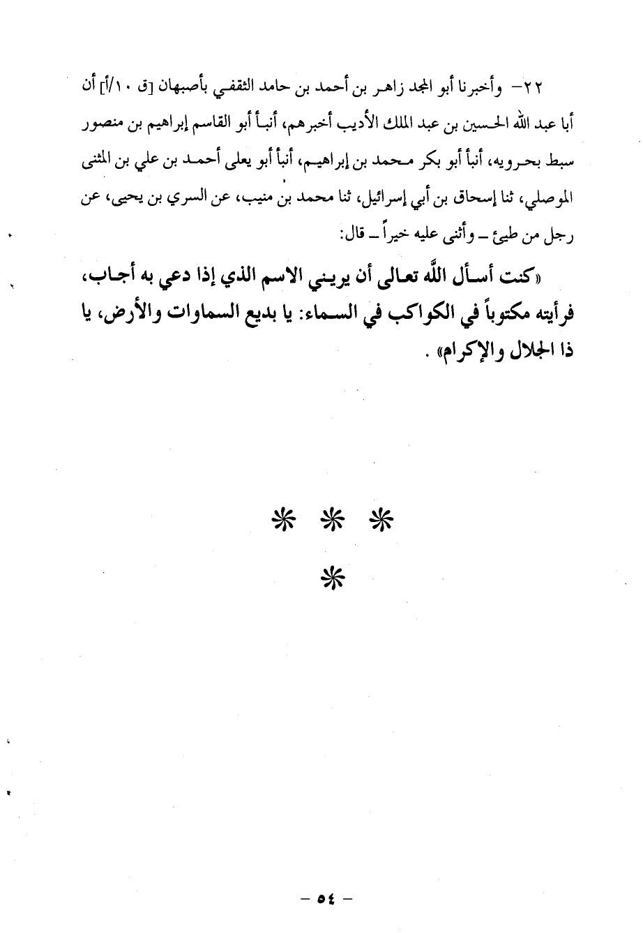 22 - وَأَخْبَرَنَا أَبُو الْمَجْدِ زَاهِرُ بْنُ أَحْمَدَ بْنِ حَامِدٍ الثَّقَفِيُّ بِأَصْبَهَانَ، أَنَّ أَبَا عَبْدِ اللَّهِ الْحُسَيْنَ بْنَ عَبْدِ الْمَلِكِ الْأَدِيبَ، أَخْبَرَهُمْ، أَنْبَأَ أَبُو الْقَاسِمِ إِبْرَاهِيمُ بْنُ مَنْصُورٍ سِبْطُ بَحْرَوَيْهِ، أَنْبَأَ أَبُو بَكْرٍ مُحَمَّدُ بْنُ إِبْرَاهِيمَ، أَنْبَأَ أَبُو يَعْلَى أَحْمَدُ بْنُ عَلِيِّ بْنِ الْمُثَنَّى الْمَوْصِلِيُّ، ثَنَا إِسْحَاقُ بْنُ أَبِي إِسْرَائِيلَ، ثَنَا مُحَمَّدُ بْنُ مُنِيبٍ، عَنِ السُّرِّيِّ بْنِ يَحْيَى، عَنْ رَجُلٍ مِنْ طَيِّئٍ، وَأَثْنَى عَلَيْهِ خَيْرًا، قَالَ: كُنْتُ أَسْأَلُ اللَّهَ تَعَالَى أَنْ يُرِيَنِي الاسْمَ الَّذِي إِذَا دُعِيَ بِهِ أَجَابَ، فَرَأَيْتُهُ مَكْتُوبًا فِي الْكَوَاكِبِ فِي السَّمَاءِ: «يَا بَدِيعَ السَّمَاوَاتِ وَالْأَرْضِ، يَا ذَا الْجَلَالِ وَالْإِكْرَامِ»