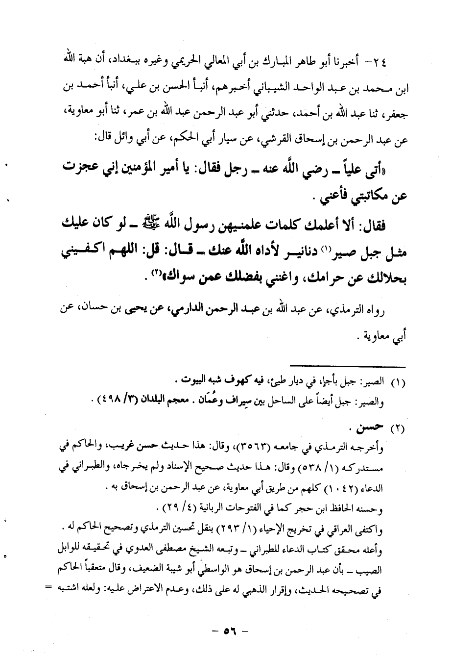 24 - أَخْبَرَنَا أَبُو طَاهِرٍ الْمُبَارَكُ بْنُ أَبِي الْمَعَالِي الْحَرِيمِيُّ، وَغَيْرُهُ بِبَغْدَادَ، أَنَّ هِبَةَ اللَّهِ بْنَ مُحَمَّدِ بْنِ عَبْدِ الْوَاحِدِ الشَّيْبَانِيَّ، أَخْبَرَهُمْ، أَنْبَأَ الْحَسَنُ بْنُ عَلِيٍّ، أَنْبَأَ أَحْمَدُ بْنُ جَعْفَرٍ، ثَنَا عَبْدُ اللَّهِ بْنُ أَحْمَدَ، حَدَّثَنِي أَبُو عَبْدِ الرَّحْمَنِ عَبْدُ اللَّهِ بْنُ عُمَرَ، ثَنَا أَبُو مُعَاوِيَةَ، عَنْ عَبْدِ الرَّحْمَنِ بْنِ إِسْحَاقَ الْقُرَشِيِّ، عَنْ سَيَّارٍ أَبِي الْحَكَمِ، عَنْ أَبِي وَائِلٍ، قَالَ: أَتَى عَلِيًّا رَضِيَ اللَّهُ عَنْهُ رَجُلٌ، فَقَالَ: يَا أَمِيرَ الْمُؤْمِنِينَ إِنِّي عَجَزْتُ عَنْ مُكَاتَبَتِي فَأَعِنِّي، فَقَالَ: أَلَا أُعَلِّمُكَ كَلِمَاتٍ عَلَّمَنِيهِنَّ رَسُولُ اللَّهِ صَلَّى اللَّهُ عَلَيْهِ وَسَلَّمَ لَوْ كَانَ عَلَيْكَ مِثْلُ جَبَلِ صِيرٍ دَنَانِيرَ لَأَدَّاهُ اللَّهُ عَنْكَ، قَالَ: قُلْ: «اللَّهُمَّ اكْفِينِي بِحَلَالِكَ عَنْ حَرَامِكَ، وَاغْنِنِي بِفَضْلِكَ عَمَّنْ سِوَاكَ» .
