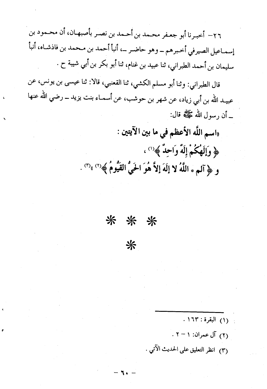 ح قَالَ الطَّبَرَانِيُّ، وَثَنَا أَبُو مُسْلِمٍ الْكَشِّيُّ، ثَنَا الْقَعْنَبِيُّ، قَالَا: ثَنَا عِيسَى بْنُ يُونُسَ، عَنْ عُبَيْدِ اللَّهِ بْنِ أَبِي زِيَادَةَ، عَنْ شَهْرِ بْنِ حَوْشَبٍ، عَنْ أَسْمَاءَ بِنْتِ يَزِيدَ رَضِيَ اللَّهُ عَنْهَا، أَنَّ رَسُولَ اللَّهِ صَلَّى اللَّهُ عَلَيْهِ وَسَلَّمَ، قَالَ: " اسْمُ اللَّهِ الأَعْظَمُ فِي مَا بَيْنَ الْآيَتَيْنِ: {وَإِلَهُكُمْ إِلَهٌ وَاحِدٌ} [البقرة: 163] و {الم {1} اللَّهُ لا إِلَهَ إِلا هُوَ الْحَيُّ الْقَيُّومُ آية 1-2} "