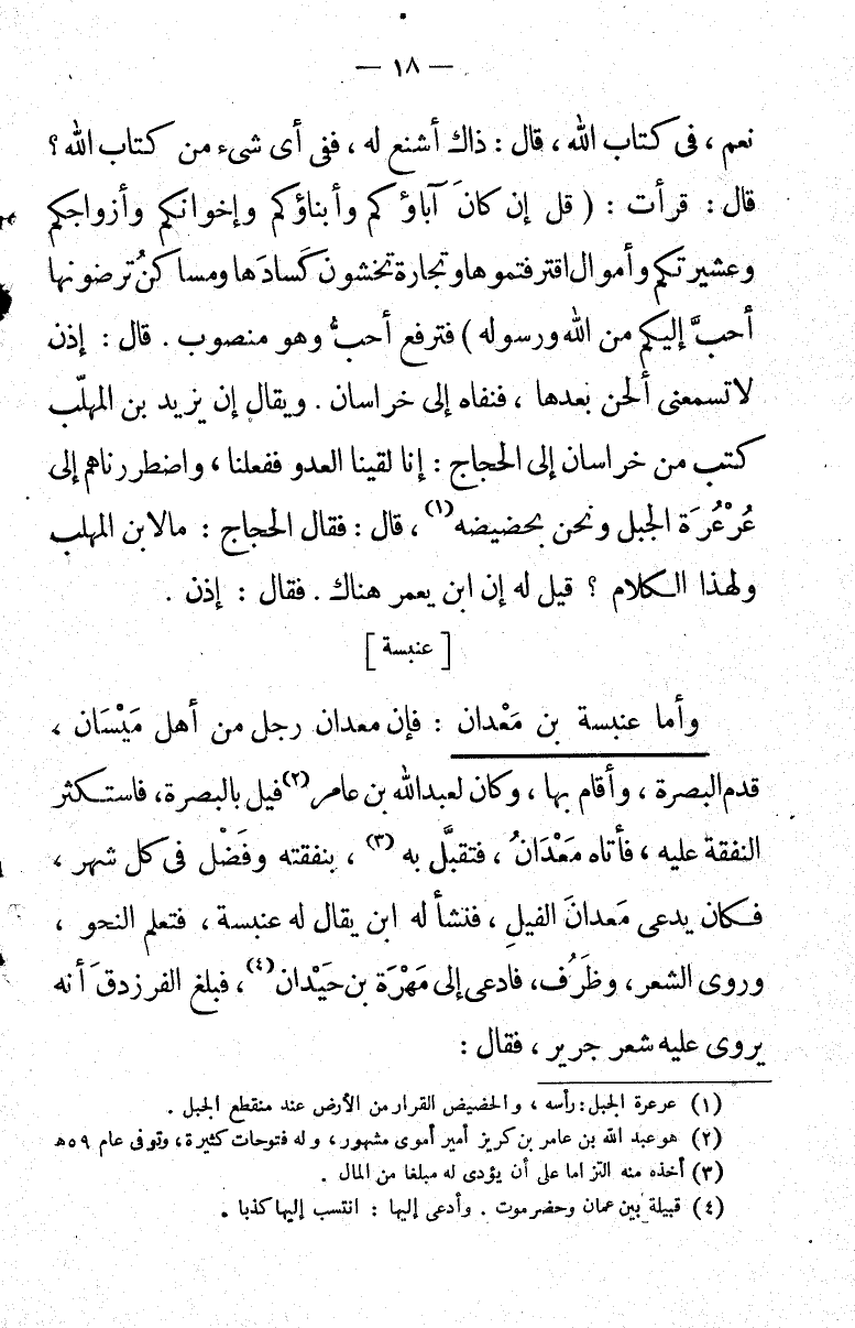 نعم في كتاب الله، قال: ذاك أشنع له ففي أي شيء من كتاب الله؟ قال: قرأت: (قل إن كان أباؤكم وأبناؤكم وإخوانكم وأزواجكم وعشيرتكم وأموالٌ اقترفتموها وتجارة تخشون كسادها ومساكن ترضونها أحبُّ إليكم من الله ورسوله) فترفع أحب وهو منصوب. قال: إذاً لا تسمعني ألحن بعدها. فنفاه إلى خراسان. ويقال إن يزيد بن المهلب كتب من خراسان إلى الحجاج: أنا لقينا العدو ففعلنا واضطررنا هم إلى عرعرة الجبل ونحن بحضيضه. قال فقال الحجاج: ما لابن المهلب ولهذا الكلام؟ قيل له: إن ابن يعمر هناك. فقال: إذاً.