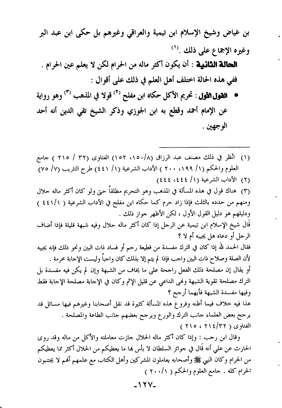 (¬3) هناك قول في هذه المسألة في المذهب وهو التحريم مطلقًا حتى ولو كان أكثر ماله حلالاً ومنهم من حدده بالثلث، فإذا زاد حرم، كما حكاه ابن مفلح في الآداب الشرعية (1/ 441) ودليلهم هو دليل القول الأول، لكن الأظهر جواز ذلك.