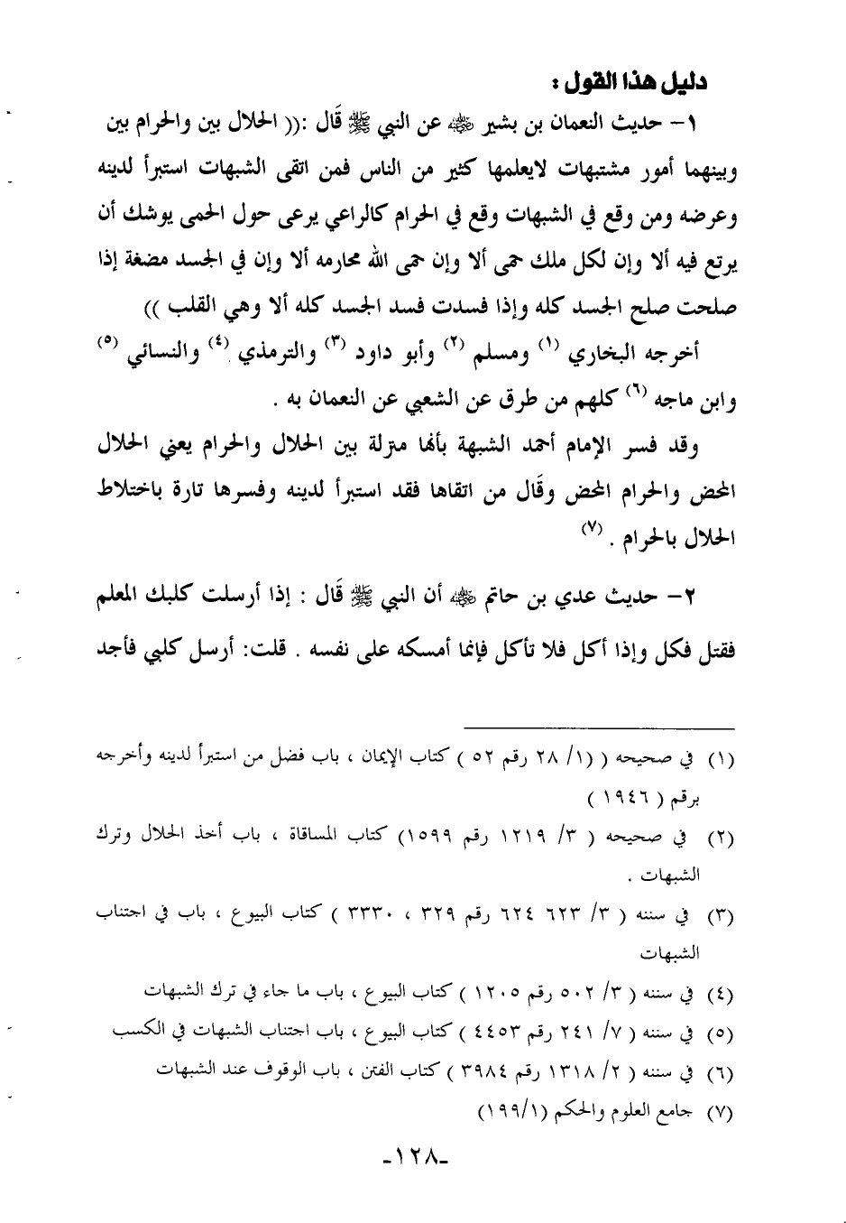 1 - حديث النعمان بن بشير رضي الله عنه عن النبي - صلى الله عليه وسلم - قال: «الحلال بين والحرام بين، وبينهما أمور مشتبهات لا يعلمها كثير من الناس، فمن اتقى الشبهات استبرأ لدينه وعرضه ومن وقع في الشبهات وقع في الحرام، كالراعي يرعى حول الحمى يوشك أن يرتع فيه، ألا وإن لكل ملك حمى، ألا وإن حمى الله محارمه، ألا وإن في الجسد مضغة إذا صلحت صلح الجسد كله، وإذا فسدت فسد الجسد كله، ألا وهي القلب».