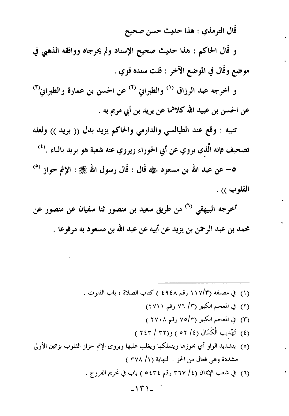5 - عن عبد الله بن مسعود رضي الله عنه قال: قال رسول الله - صلى الله عليه وسلم -: «الإثم حواز (¬5) القلوب».