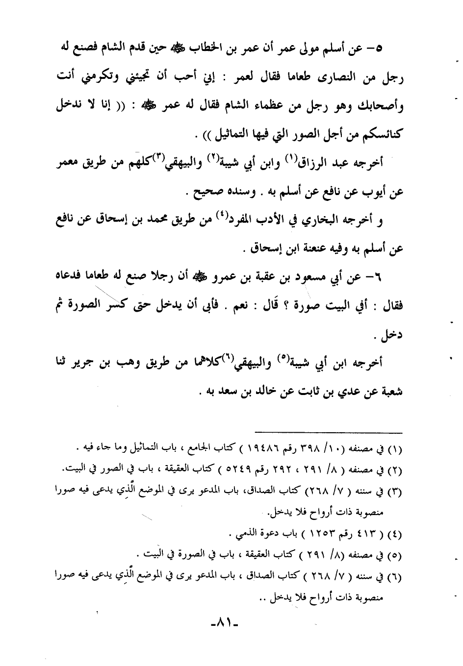 (¬6) في سننه (7/ 268) كتاب الصداق، باب المدعو يرى في الموضع الذي يدعى فيه صورا منصوبة ذات أرواح فلا يدخل.
