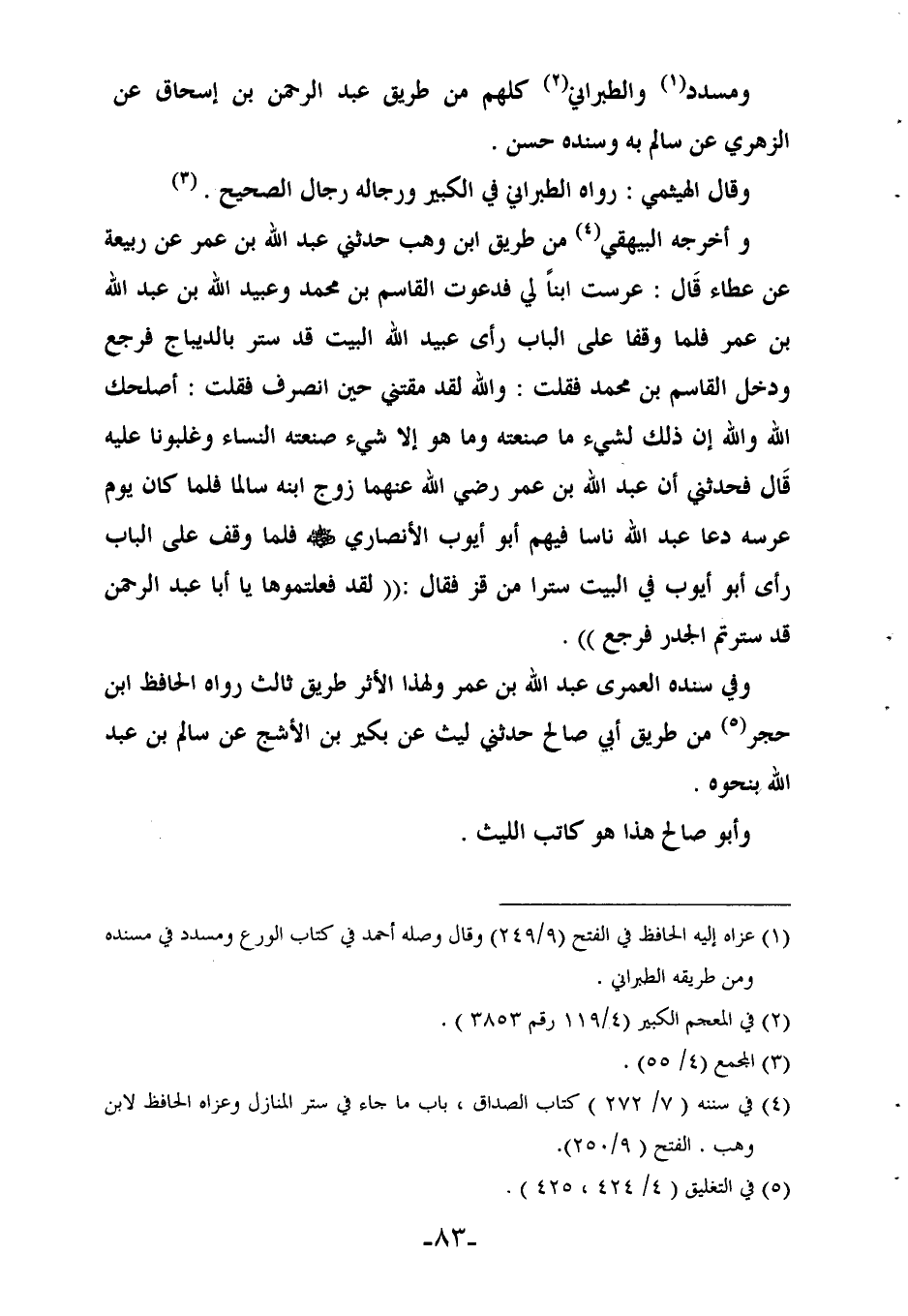(¬4) في سننه (7/ 272) كتاب الصداق، باب ما جاء في ستر المنازل وعزاه الحافظ لابن وهب. الفتح (9/ 250).