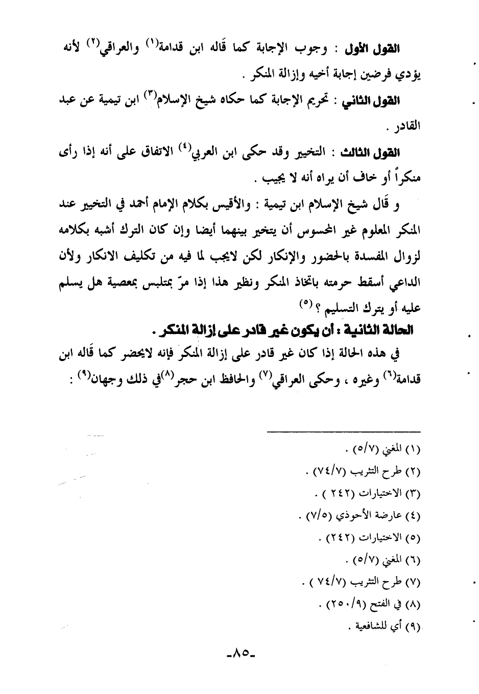 في هذه الحالة إذا كان غير قادر على إزالة المنكر فإنه لا يحضر كما قاله ابن قدامة (¬6) وغيره، وحكى العراقي (¬7) والحافظ ابن حجر (¬8) في ذلك وجهين (¬9):
