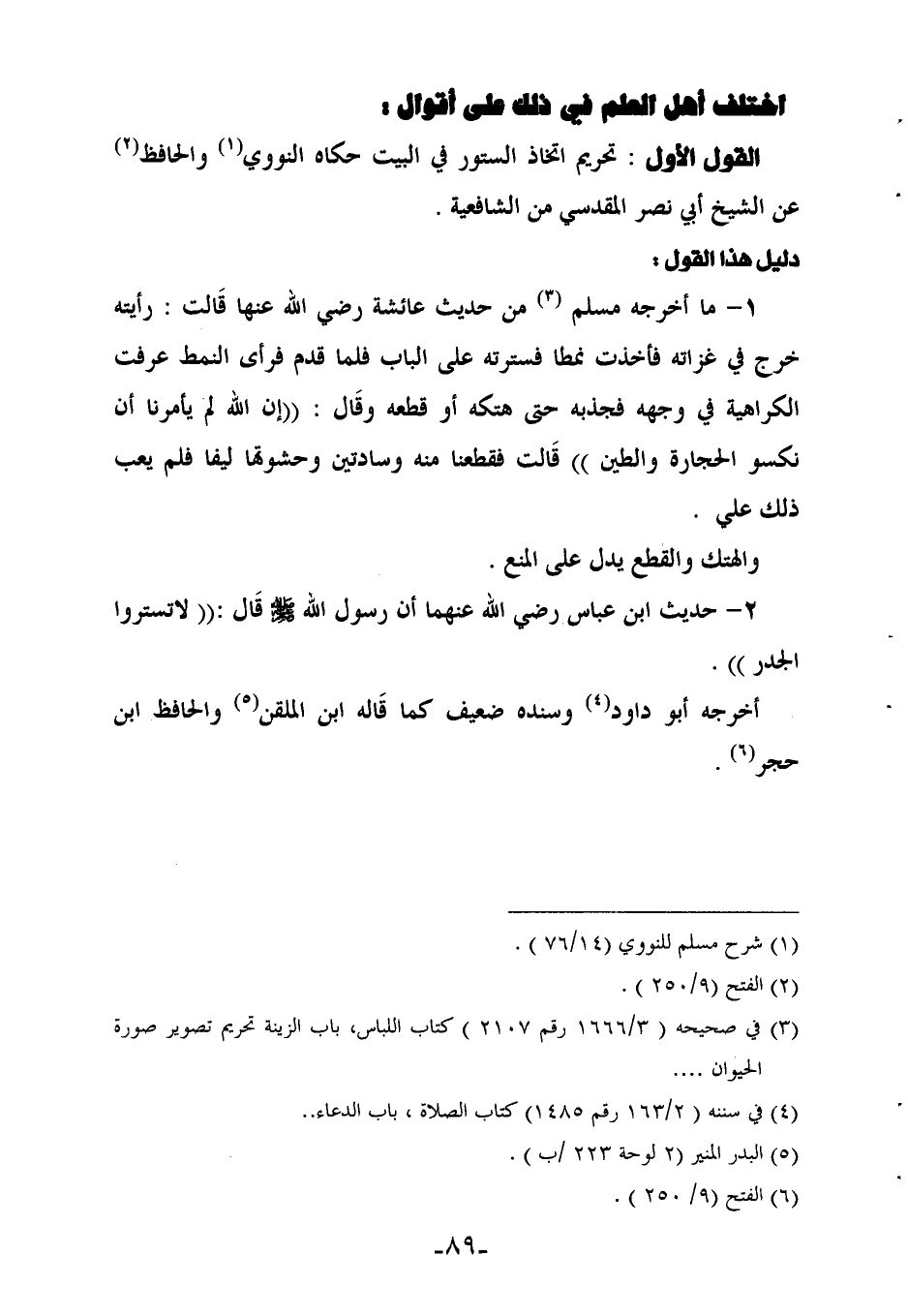 القول الأول: تحريم اتخاذ الستور في البيت حكاه النووي (¬1) والحافظ (¬2) عن الشيخ أبي نصر المقدسي من الشافعية.