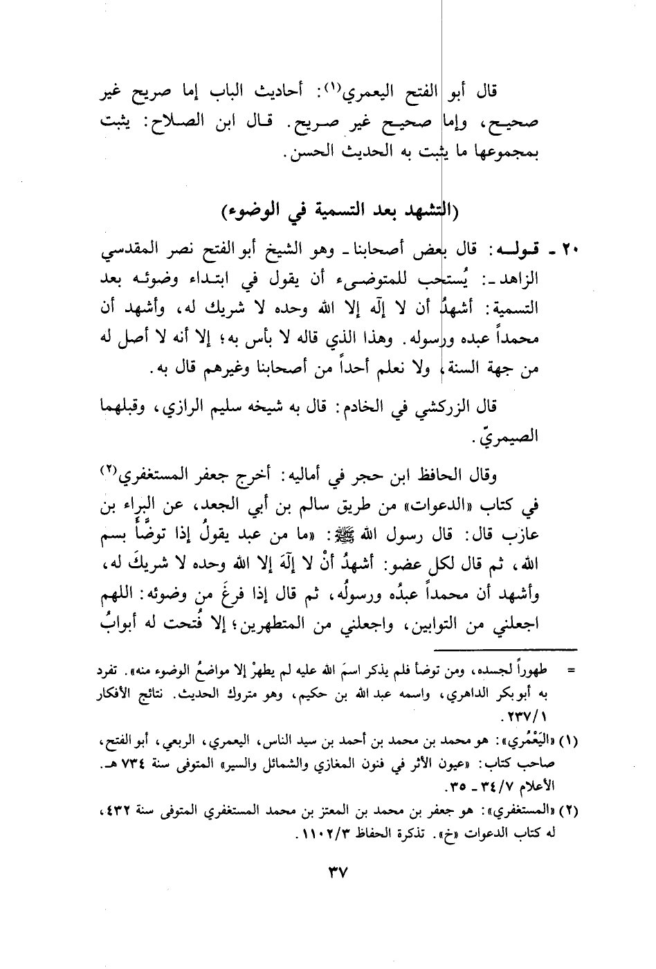 قوله: قال بعض أصحابنا وهو الشيخ أبو الفتح نصر المقدسي الزاهد: يستحب للمتوضي أن يقول في ابتداء وضوئه بعد التسمية: (أشهد أن لا إله إلا الله وحده لا شريك له، واشهد أن محمد عبده ورسوله) وهذا الذي قاله لا بأس به، إلا أنه لا أصل له من جهة السنة، ولا نعلم أحدا من أصحابنا وغيرهم قال به.
