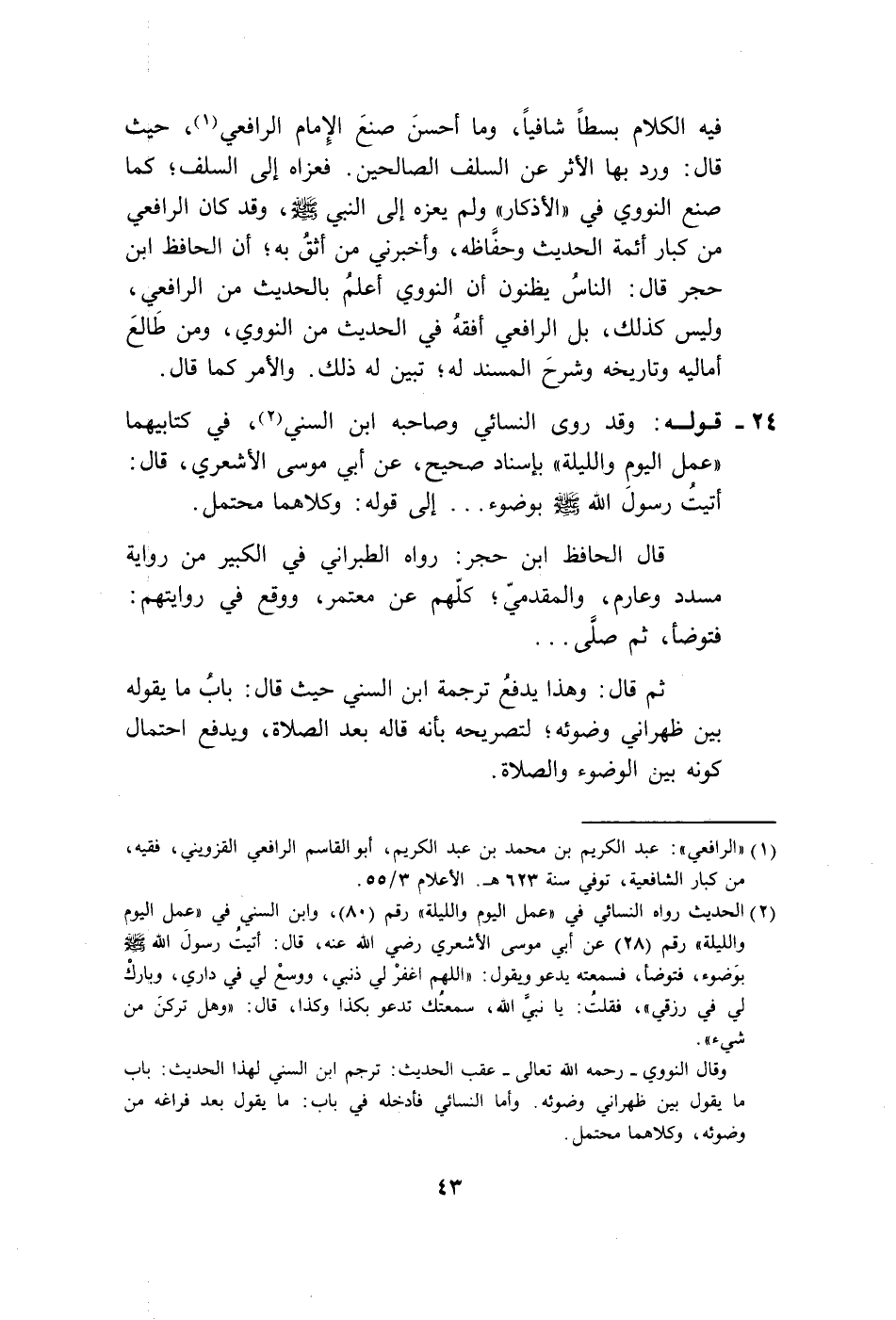 قوله: وقد روى النسائي، وصاحبه ابن السني في كتابيهما عمل اليوم والليلة بإسناد صحيح عن أبي موسى الأشعري قال: (أتيت رسول الله صلى الله عليه وسلم بوضوءه) إلى قوله: وكلاهما محتمل.