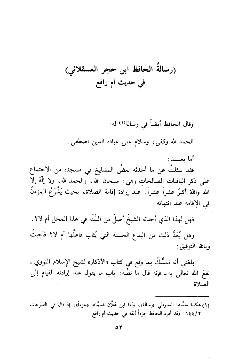 وقال الحافظ أيضا في رسالة له: الحمد لله وكفى وسلام على عباده الذين اصطفى، أما بعد: فقد سئلت عن ما أحدثه بعض المشايخ في مسجده من الإجتماع على ذكر الباقيات الصالحات، وهي سبحانه الله، والحمد لله، ولا إله إلاّ الله، والله أكبر عشرا عشرا عند إرادة إقامة الصلاة، بحيث يشرع المؤذن في الإقامة عند انتهائه فهل لهذا الذي أحدثه الشيخ أصل من السنة في هذا المحل أولا؟ وهل يعد ذلك من البدع الحسنة التي يثاب فاعلها أولا؟ فأجبت وبالله التوفيق.