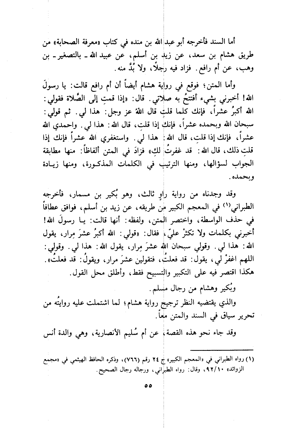 وقد وجدناه من رواية راو ثالث وهو بكير بن مسمار، فأخرجه الطبراني في المعجم الكبير من طريقه عن زيد بن أسلم فوافق عطافا في حذف الواسطة. واختصر المتن ولفظه أنها قالت: يا رسول الله أخبرني بكلمات ولا تكثر علي فقال: قولي الله أكبر عشر مرار يقول الله: هذا لي، وقولي: سبحانه الله عشرا مرار يقول الله: هذا لي، وقولي اللهم اغفر لي يقول: قد فعلت فتقولين عشر مرار، ويقول قد فعلت. هكذا اقتصر فيه على التكبير والتسبيح فقط، وأطلق محل القول ويكبر، وكذا هشام بن سعد من رجال مسلم، والذي يقتضيه النظر ترجيح رواية هشام لما اشتملت عليه روايته من تحرير سياق في السند والمتن معا.