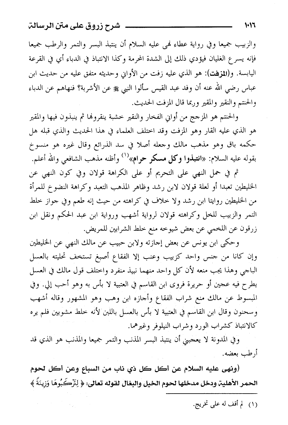 وبالزبيب جميعا وفي رواية عطاء نهى عليه السلام أن ينتبذ البسر والتمر والرطب جميعا فإن يسرع الغليان فيؤدي ذلك إلى الشدة المحرمة وكذا الانتباذ في الدباء أي في القرعة اليابسة. و (المزفت): هو الذي عليه زفت من الأواني وحديثه متفق عليه من حديث ابن عباس رضي الله عنه أنه وفد عبد القيس سألوا النبي صلى الله عليه وسلم عن الأشربة؟ فنهاهم عن الدباء والحنتم والنقير والمقير وربما قال المزفت الحديث.