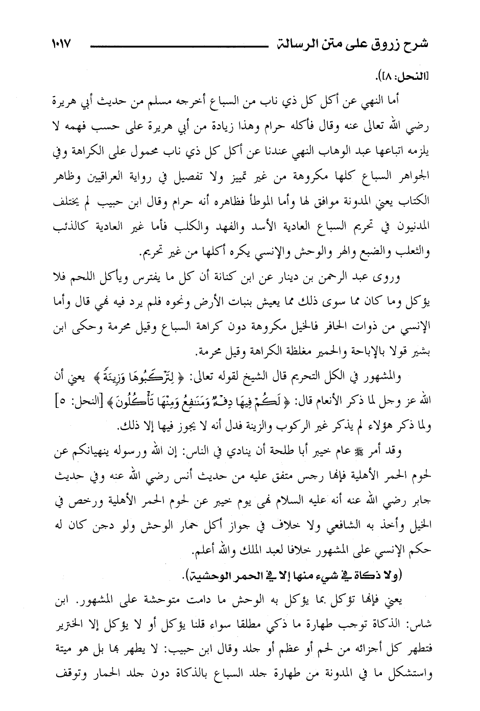 أما النهي عن أكل كل ذي ناب من السباع أخرجه مسلم من حديث أبي هريرة رضي الله تعالى عنه وقال فأكله حرام وهذا زيادة من أبي هريرة على حسب فهمه لا يلزمه اتباعها عبد الوهاب الني عندنا عن أكل كل ذي ناب محمول على الكراهة وفي الجواهر السباع كلها مكروهة من غير تمييز ولا تفصيل في رواية العراقيين وظاهر الكتاب يعني المدونة موافق لها وأما الموطأ فظاهره أنه حرام وقال ابن حبيب لم يختلف المدنيون في تحريم السباع العادية الأسد والفهد والكلب فأما غير العادية كالذئب والثعلب والضبع والهر والوحش والإنسي يكره أكلها من غير تحريم.