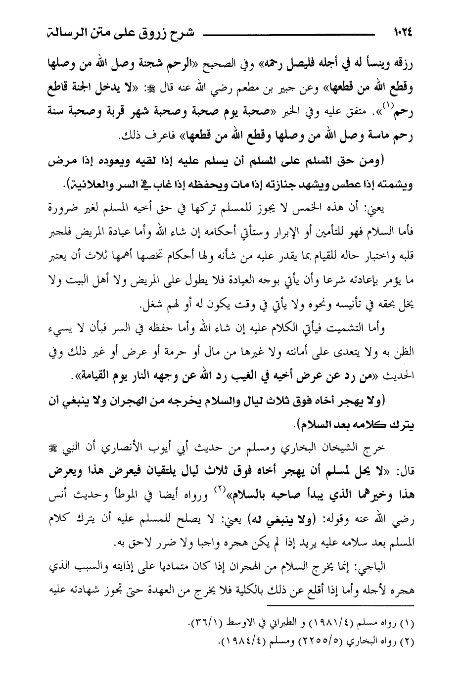 رزقه وينسأ له في أجله فليصل رحمه" وفي الصحيح" الرحم شجنة وصل الله من وصلها وقطع الله من قطعها" وعن جبير بن مطعم رضي الله عنه قال صلى الله عليه وسلم: " لا يدخل الجنة قاطع رحم" متفق عليه وفي الخير" صحبة يوم صحبة وصحبة شهر قربة وصحبة سنة رحم ماسة وصل الله من وصلها وقطع الله من قطعها" فاعرف ذلك.