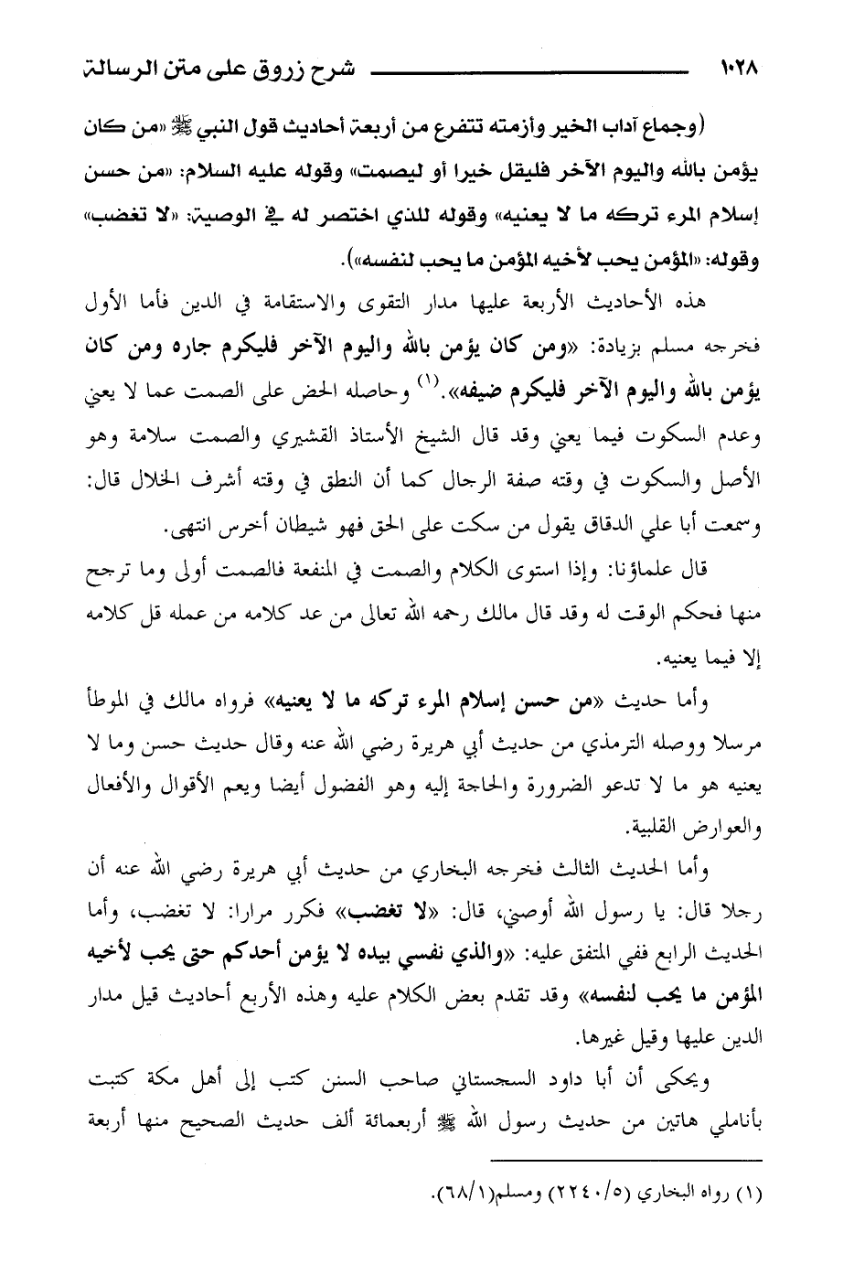 (وجماع آداب الخير وأزمته تتفرع من أربعة أحاديث قول النبي صلى الله عليه وسلم " من كان يؤمن بالله واليوم الآخر فليقل خيرا أو ليصمت" وقوله عليه السلام: " من حسن إسلام المرء تركه ما لا يعنيه" وقوله للذي اختصر له في الوصية: " لا تغضب" وقوله: " المؤمن يحب لأخيه المؤمن ما يحب لنفسه").