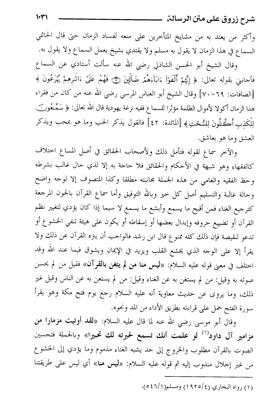 والآخر سماع لقوله فتأمل ذلك ولأصحاب الحقائق في أصل المساع اختلاف كالفقاء وهو شبهة في الأحكام والحقائق فلا حاجة به إلا لذي حال غالب بشرطه وحظ الفقيه والعامي من هذه الجملة مجانبته مطلقا وكذا المتصوف إلا لوج واضح وحالة غالبة والتسليم أصل كل خير وبالله التوفيق وأما سماع القرآن بالحون المرجعة كترجيع الغناء فمن أقبح ما يسمع وأبشع ما يسمع لا سيما إذا كان يؤدي لتغيير نظم القرآن أو تضييع حروفه وإبدال بعضها أو إسقاطه أو يكون على هيئة تنفي الخشوع أو تدعو لنقيصة فإن ذلك كله ممنوع قال ابن رشد فالجواجب أن ينزه القرآن عن ذلك ولا يقرأ إلا على الوجه الذي يخشع القلب ويزيد في الإيمان ويشوق فيما عند الله وقد اختلف في معنى قوله عليه السلام: " ليس منا من لم يتغن بالقرآن" فيل من لم يحسن صوته به وقيل: من لم يستغن به عن الغناء وقيل: من لم يستغن به عن الناس وقيل غير ذلك، وما يروى عن حديث معاوية أنه عليه السلام رجع يوم فتح مكة وهو يقرأ سورة الفتح حمل على قراءته بطريق الأداء من المد ونحوه.