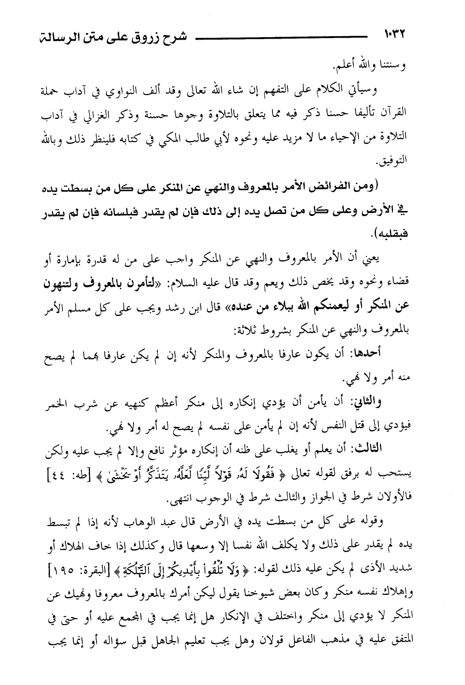 يعني أن الأمر بالمعروف والنهي عن المنكر واجب على من له قدرة بإمارة أو قضاء ونحوه وقد يخص ذلك ويعم وقد قال عليه السلام: " لتأمرن بالمعروف ولتنهون عن المنكر أو ليعمنكم البلاء من عنده" قال ابن رشد ويجب على كل مسلم الأمر بالمعروف والنهي عن المنكر بشروط ثلاثة: