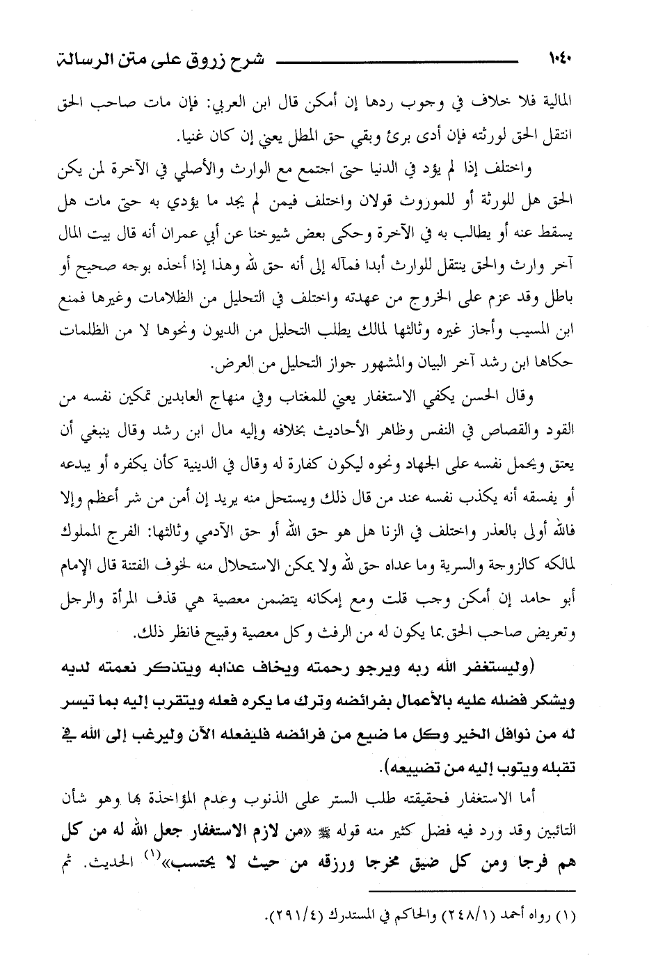 واختلف إذا لم يؤد في الدنيا حتى اجتمع مع الوارث والأصلي في الآخرة لمن يكن الحق هل للورثة أو للموروث قولان واخلتف فيمن لم يجد ما يؤدي به حتى مات هل يسقط عنه أو يطالب به في الآخرة وحكى بعض شيوخنا عن أبي عمران أنه قال بيت المال آخر وارث والحق ينتقل للوارث أباد فمآله إلى أنه حق لله وهذا ما أخذه بوجه صحيح أو باطل وقد عزم على الخروج من عهدته واختلف في التحليل من الظلامات وغيرها فمنع ابن المسيب وأجازه غيره وثالثها لمالك يطلب التحليل من الديون ونحوها لا من الظلمات حكاها ابن رشد آخر البيان والمشهور جواز التحليل من العرض.