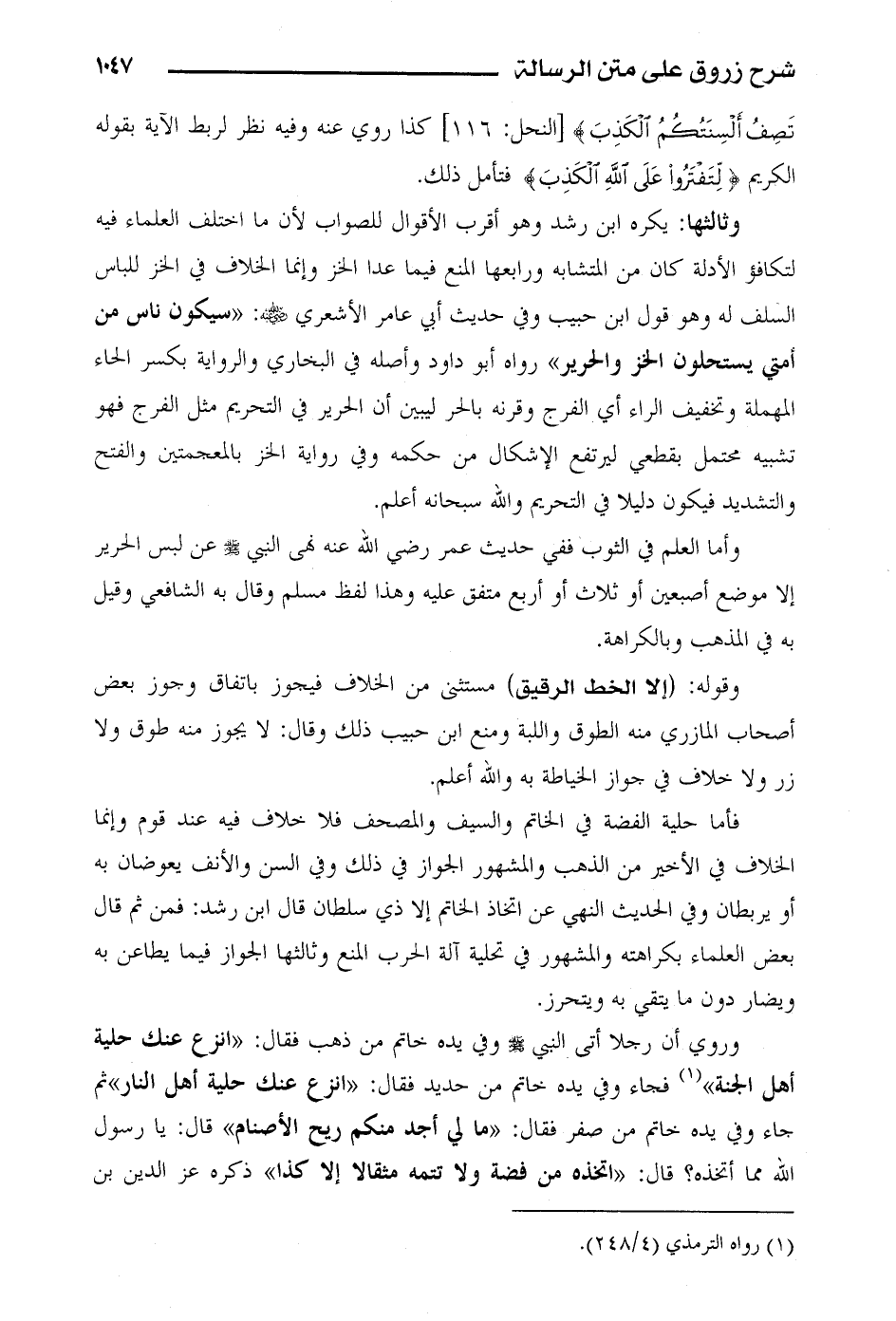 وثالثها: يكره ابن رشد وهو أقرب الأقوال للصواب لأن ما اختلف العلماء فيه لتكافؤ الأدلة كان من المتشابه ورابعها المنع فيما عدا الخز وإنما الخلاف في الخز للباس السلف له وهو قول ابن حبيب وفي حديث أبي عامر الأشعري رضي الله عنه: " سيكون ناس من أمتي يستحلون الخز والحرير" رواه أبو داود وأصله في البخاري والرواية بكسر الحاء المهملة وتخفيف الراء أي الفرج وقرنه بالحر ليبين أن الحرير في التحريم مثل الفرج فهو تشبيه محتمل بقطعي ليرتفع الإشكال من حكمه وفي رواية الخز بالمعجمتين والفتح والتشديد فيكون دليلا في التحريم والله سبحانه أعلم.