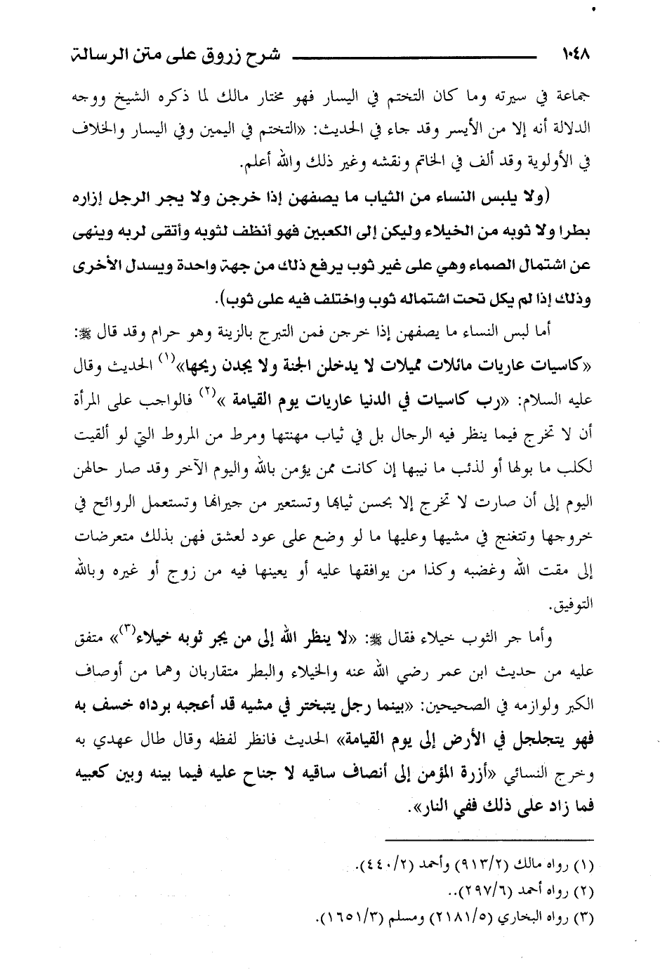 (ولا يلبس النساء من الثياب ما يصفهن إذا خرجن ولا يجر الرجل إزاره بطرا ولا ثوبه من الخيلاء وليكن إلى الكعبين فهو أنظف لثوبه وأتقى لربه وينهى عن اشتمال الصماء وهي على غير ثوب يرفع ذلك من جهة واحدة ويسدل الأخرى وذلك إذا لم يكل تحت اشتماله ثوب واختلف فيه على ثوب).