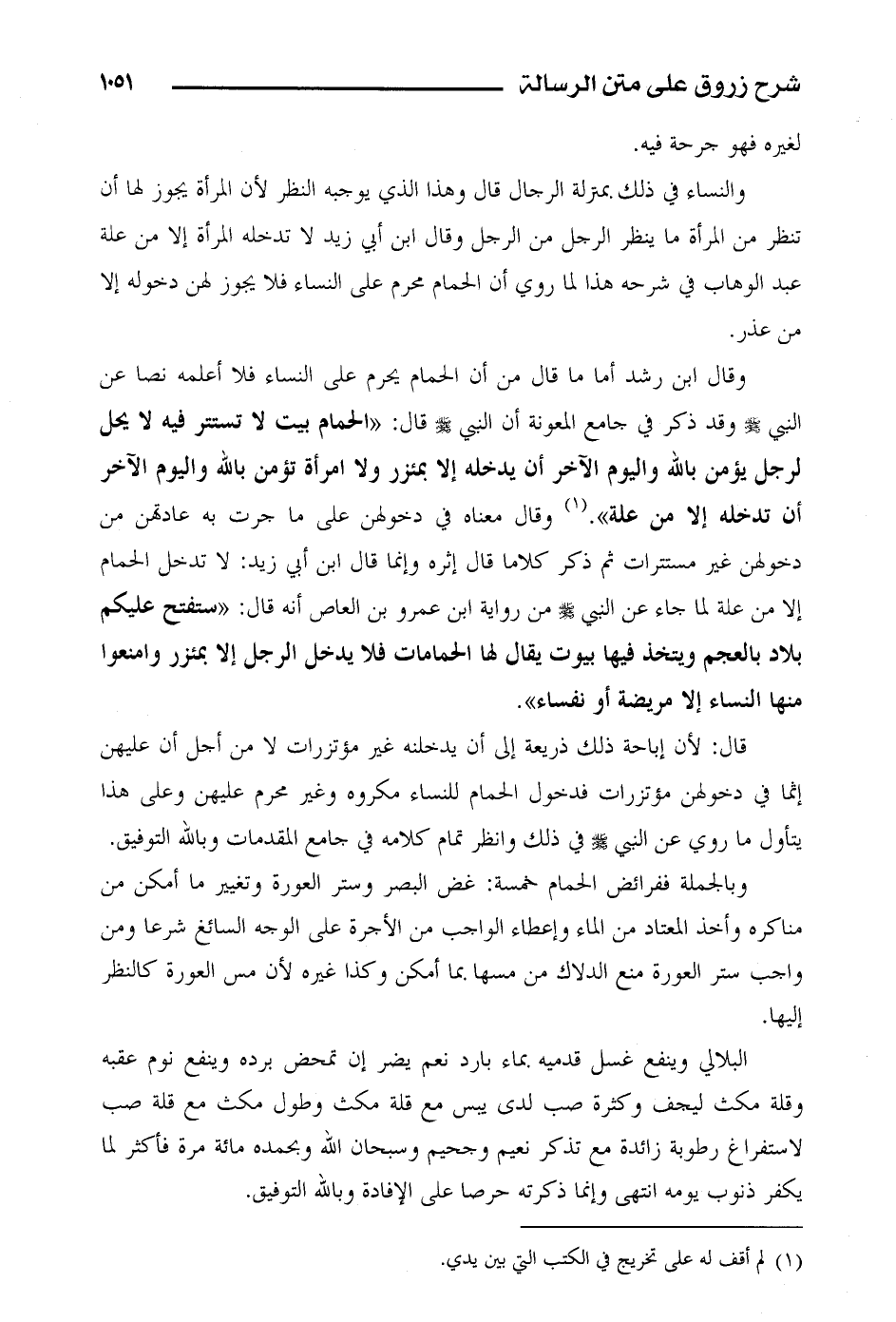 وقال ابن رشد أما ما قال من أن الحمام يحرم على النساء فلا أعلمه نصا عن النبي صلى الله عليه وسلم وقد ذكر في جامع المعونة أن النبي صلى الله عليه وسلم قال: " الحمام بيت لا تستتر فيه لا يحل لرجل يؤمن بالله واليوم الآخر أن يدخله إلا بمئزره ولا مرأة تؤمن بالله واليوم الآخر أن تدخله إلا من علة" وقال معناه في دخولهن على ما جرت به عادتهن من دخولهن غير مستترات ثم ذكر كلاما قال إثره وإنما قال ابن أبي زيد: لا تدخل الحمام إلا من علة لما جاء عن النبي صلى الله عليه وسلم من رواية ابن عمرو بن العاص أنه قال: " ستفتح عليكم بلاد بالعجم ويتخذ فيها بيوت يقال لها الحمامات فلا يدخل الرجل إلا بمئزر وامنعوا منها النساء إلا مريضة أو نفساء".