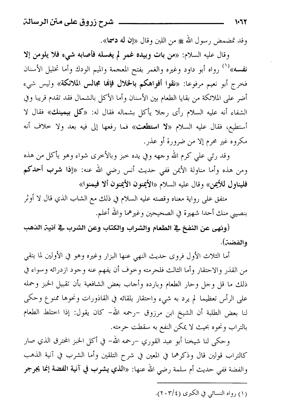 وحكى لنا شيخنا أبو عبد القوري – رحمه الله – في أكل الخبز المحترق الذي صار كالتراب قولين قال وذكرهما في المعين في شرح التلقين وأما الشرب في آنية الذهب والفضة ففي حديث أم سلمة رضي الله عنها: " الذي يشرب في آنية الفضة إنما يجرجر