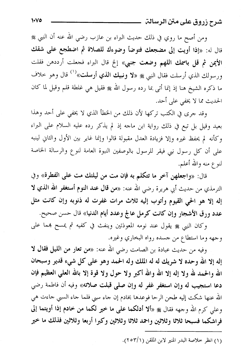 ومن أصح ما روي في ذلك حديث البراء بن عازب رضي الله عنه أن النبي صلى الله عليه وسلم قال له: " إذا أويت إلى مضجعك فتوضأ وضوءك للصلاة ثم اضطجع على شقك الأيمن ثم قل باسمك اللهم وضعت جنبي" إلخ قال البراء فجعلت أرددهن فقلت ورسولك الذي أرسلت فقالن النبي صلى الله عليه وسلم " لا ونبيك الذي أرسلت" قال وهو خلاف ما ذكره الشيخ هنا إذ إنما أتى بما رده رسول الله صلى الله عليه وسلم فقيل هي غلطة قلم وقيل لما كان الحديث مما لا يخفي على أحد.