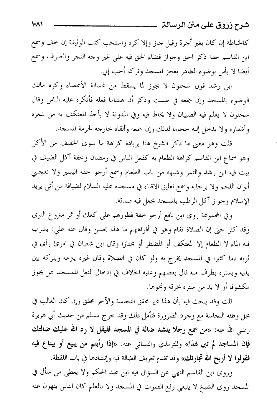 قلت وقد يبحث فيه بأن هذا غير محقق النجاسة والآخر محقق وإن كان الغالب في محل وطئه النجاسة مع وجود الضرورة فتأمل ذلك وقد خرج مسلم من حديث أبي هريرية رضي الله عنه: " من سمع رجلا ينشد ضالة في المسحد فليقل لا رد الله عليك ضالتك فإن المساجد لم تبن لهذا" وللترمذي والنسائي عنه: " إذا رأيتم من يبيع أو يبتاع فيه فقولوا لا أربع الله تجارتك" وقد تقدم تعريف الضالة فيه وإنشادها في باب اللقطة.