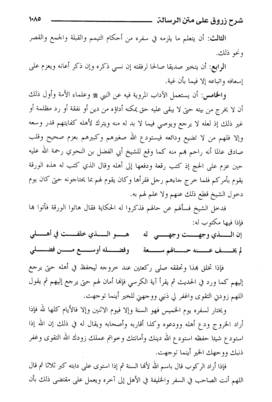 والخامس: أن يستعمل الآداب المروية فيه عن النبي صلى الله عليه وسلم وعلماء الأمة وأول ذلك أن لا يخرج من بيته حتى لا يبقى عليه حق يمكنه أداؤه من دين أو نفقة أو رد مظلمة أو غير ذلك إذ لعله لا يرجع ويوصي فيما بلا بد له منه ويترك لأهله كفايتهم قدر وسعة وإلا فلهم من لا تضيع ودائعه فيستودع الله صغيرهم وكبيرهم بعزم صحيح وقلب صادق عالما أنه راحم بهم مه كما وقع للشيخ أبي الفضل بن النحوي رحمة الله عليه حين عزم على الحج إذ كتاب رقعة ودفعها إلى أهله وقال الذي كتب له هذه الورقة يقولم بأمركم فلما خرج جاءهم رجل فقرأها وكان يقوم لهم بما يحتاجونه حتى كان يوم دخول الشيخ قطع ذلك عنهم ولا علم لهم به.