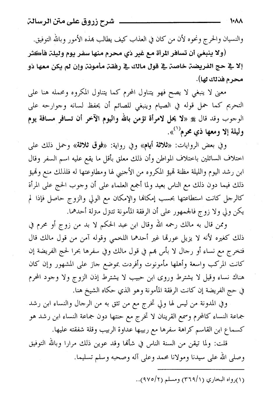 وفي المدونة من ليس لها ولي تخرج مع من تثق به من الرجال والنساء ابن رشد جماعة النساء كالمحرم وسمع القرينان لا تخرج مع حنتها دون جماعة النساء ابن رشد هو كسماع ابن القاسم كراهة سفرها مع ربيبها عداوة الربيب وقلة شفقته عليها.