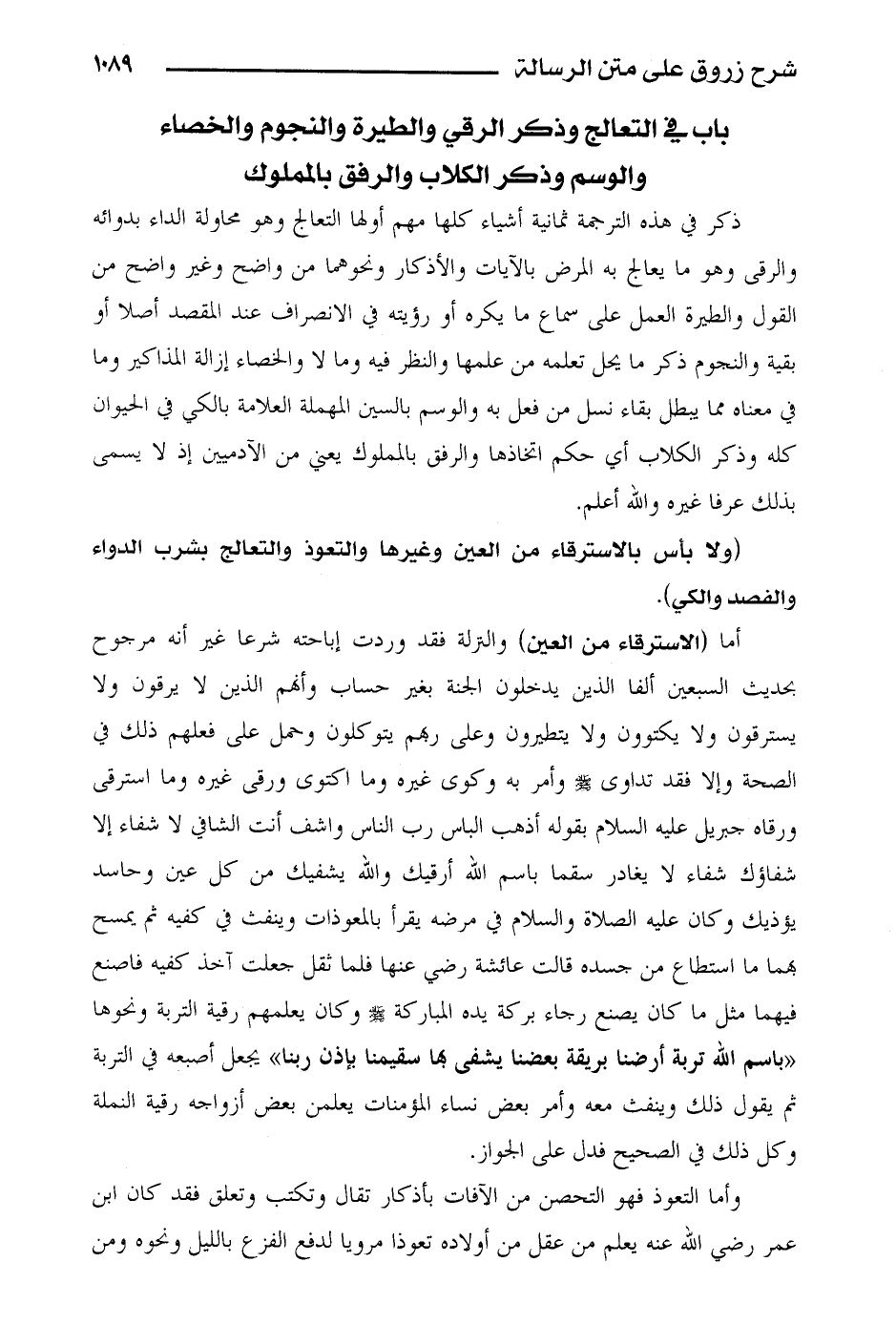 أما (الاسترقاء من العين) والنزلة فقد وردت إباحته شرعا غير أنه مرجوح بحديث السبعين ألفا الذين يدخلون الجنهة بغير حساب وأنهم الذين لا يرقون ولا يسترقون ولا يكتوون ولا يتطيرون وعلى ربهم يتوكلون وحمل على فعلهم ذلك في الصحة وإلا فقد تداوى صلى الله عليه وسلم وأمر به وكوى غيره وما اكتوى ورقى غيره وما استرقى ورقاه جبريل عليه السلام بقوله أذهب الباس رب الناس واشف أنت الشافي لا شفاء إلا شفاؤك شفاء لا يغادر سقما باسم الله أرقيك والله يشفيك من كل عين وحاسد يؤذيك وكان عليه الصلاة والسلام في مرضه يقرأ بالمعوذات وينفث في كفيه ثم يمسح بهما ما استطاع من جسده قالت عائشة رضي الله عنها فلما ثقل جعلت آخذ كفيه فاصنع فيهما مثل ما كان يصنع رجاء بركة يده المباركة صلى الله عليه وسلم وكان يعلمهم رقية التربة ونحوها " باسم الله تربة أرضنا بريقة بعضنا يشفى بها سقيمنا بإذن ربنا" يجعل أصبعه في التربة ثم يقول ذلك وينفث معه وأمر بعض نساء المؤمنات يعلمن بعض أزواجه رقية النملة وكل ذلك في الصحيح فدل على الجواز.