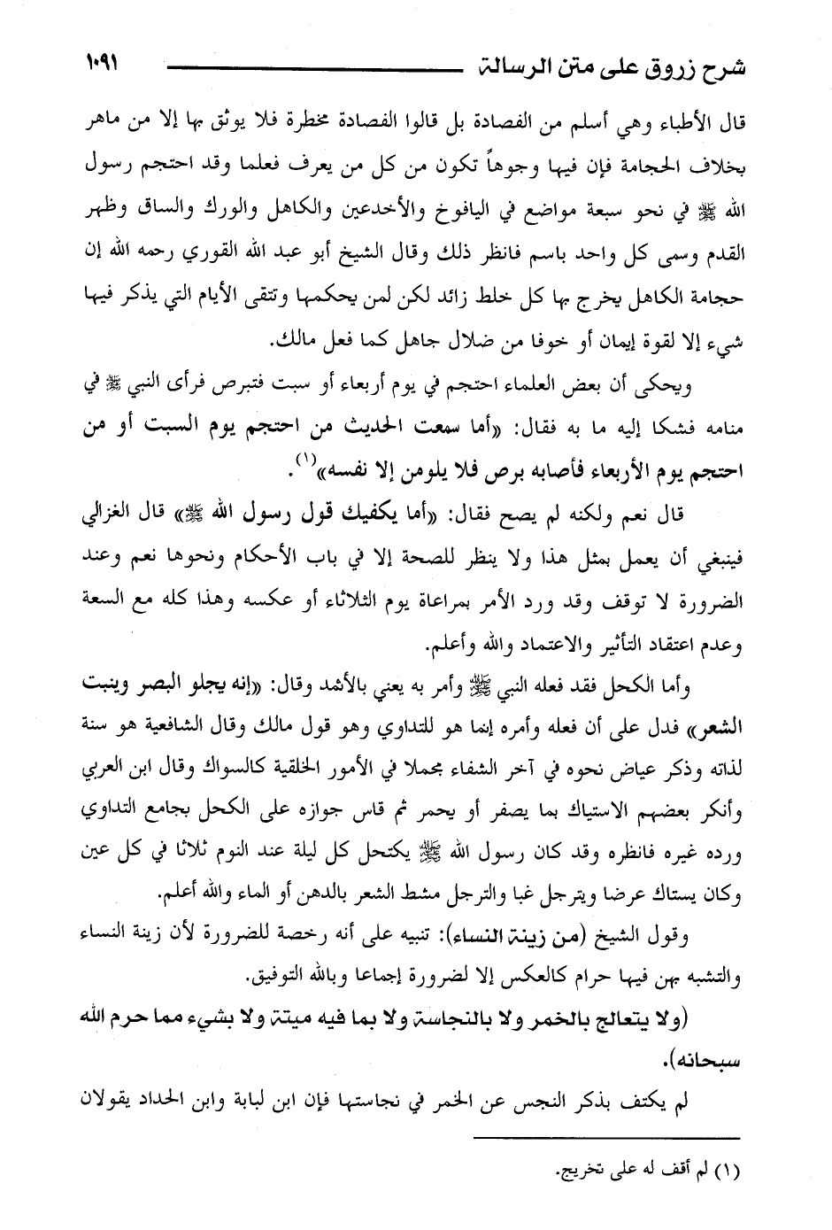 ويحكى أن بعض العلماء احتجم في يوم أربعاء أو سبت فتبرص فرأى النبي صلى الله عليه وسلم في منامه فشكا إليه ما به فقال: " أما سمعت الحديث من احتجم يوم السبت أو من احتجم يوم الأربعاء فأصابه برص فلا يلومن إلا نفسه".