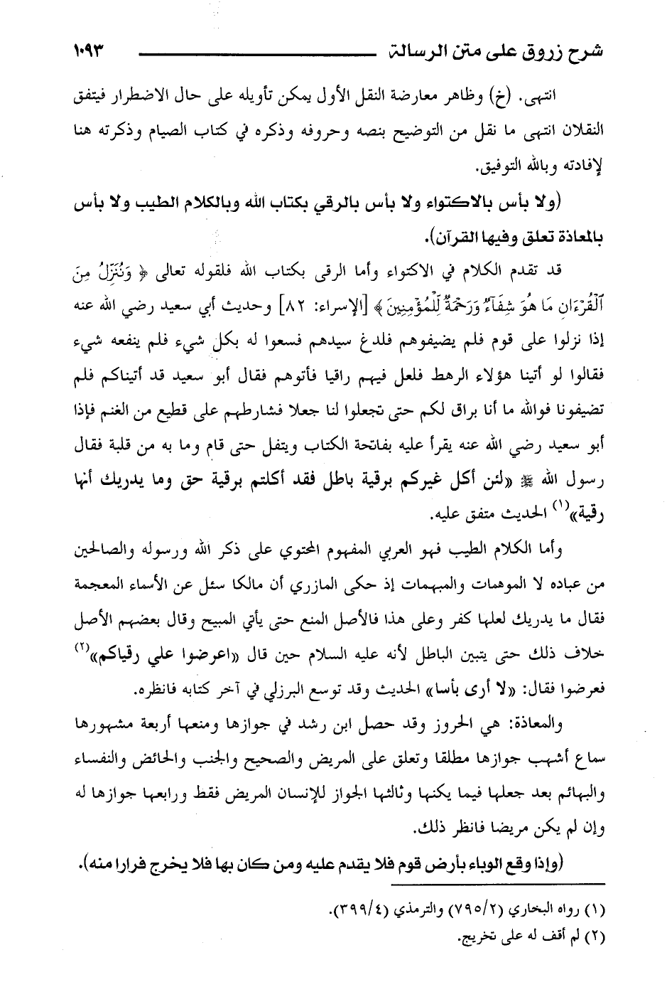 (ولا بأس بالاكتواء ولا بأس بالرقي بكتاب الله والكلام الطيب ولا بأس بالمعاذاة تعلق وفيها القرآن).