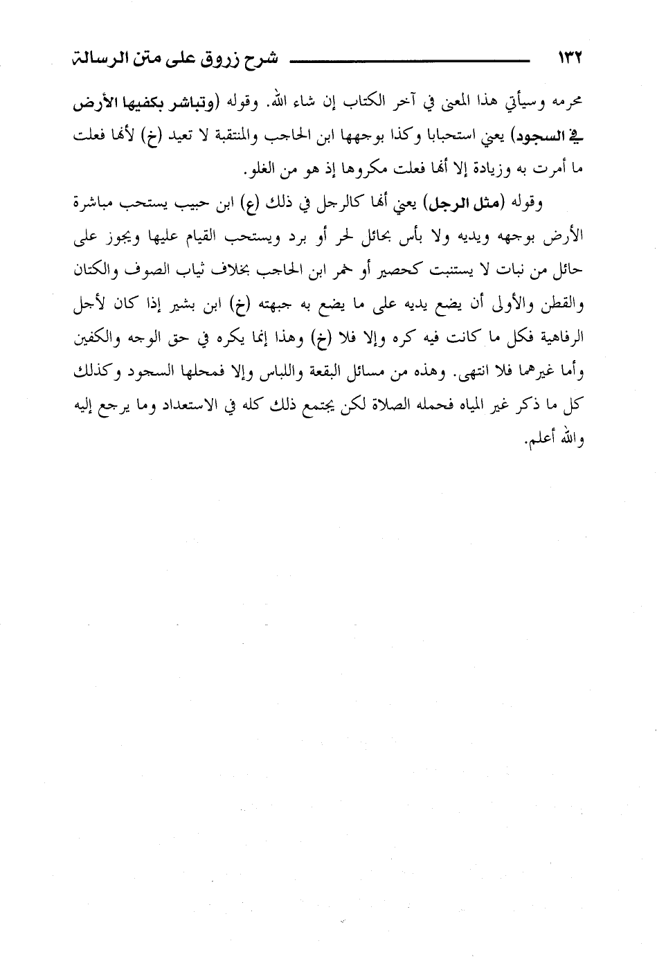 محرمه وسيأتي هذا المعنى في آخر الكتاب إن شاء الله. وقوله (وتباشر بكفيها الأرض في السجود) يعني استحباباً وكذا بوجهها ابن الحاجب والمنتقبة لا تعيد (خ) لأنها فعلت ما أمرت به وزيادة إلا أنها فعلت مكروهاً إذ هو من الغلو.