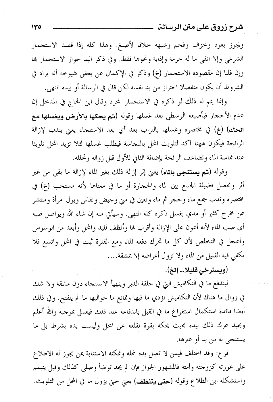 وإنما يتم له ذلك لو ذكره في الاستجمار المجرد وقال ابن الحاج في المدخل إن عدم الأحجار فبأصبعه الوسطى بعد غسلها وقوله (ثم يحكها بالأرض ويغسلها مع الحك) (خ) في مختصره وغسلها بالتراب بعد أي بعد الاستنجاء يعني يندب لإزالة الرائحة فيكون ههنا آكد لتلويث المحل بالنجاسة فيطلب فغسلها لئلا تزيد المحل تلويثاً عند مماسة الماء وتضاعف الرائحة بإضافة الثاني للأول قبل زواله وتحلله.
